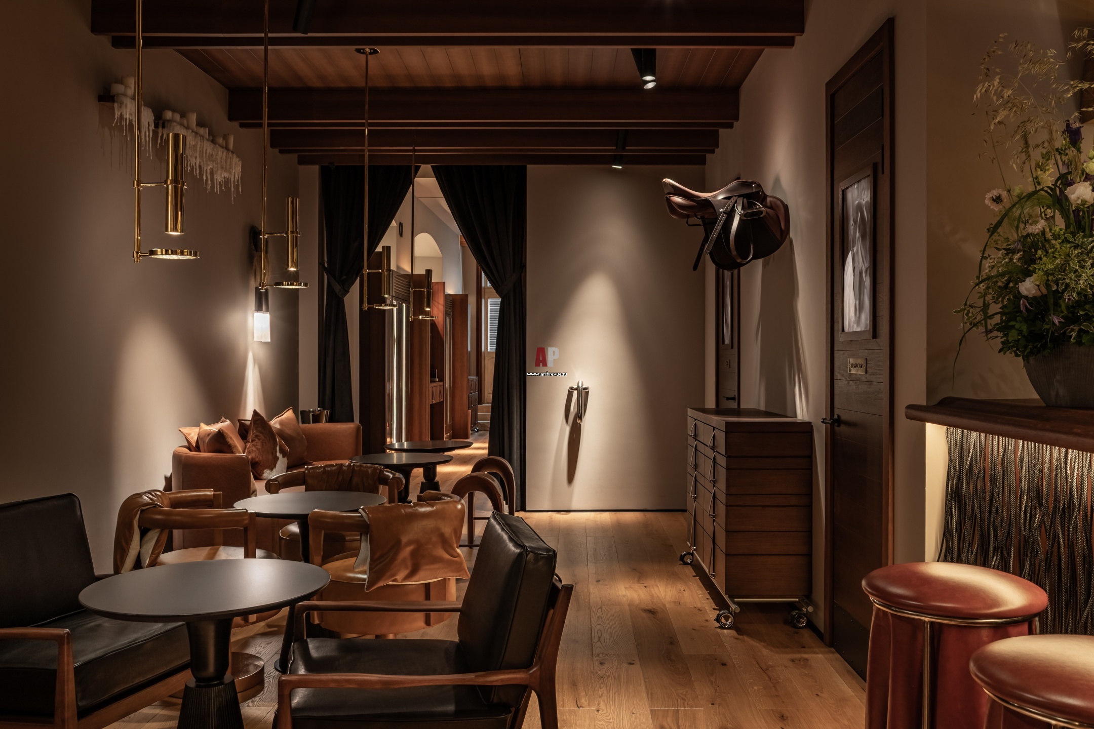 В отделке, помимо травертина, стали, состаренного дерева использован шпон экзотического дерева этимое, от природы имеющего темный красно-коричневый оттенок, который делает его похожим на старые доски конюшни. В интерьере множество оригинальных решений, например, двери санузла сделаны в виде входов в стойла. Вместо окошек в них вмонтированы экраны, на которых транслируется видео с лошадью, как бы находящейся внутри. Лошадь ходит по загону и периодически подходит к окошку, просовывая в него свою морду…