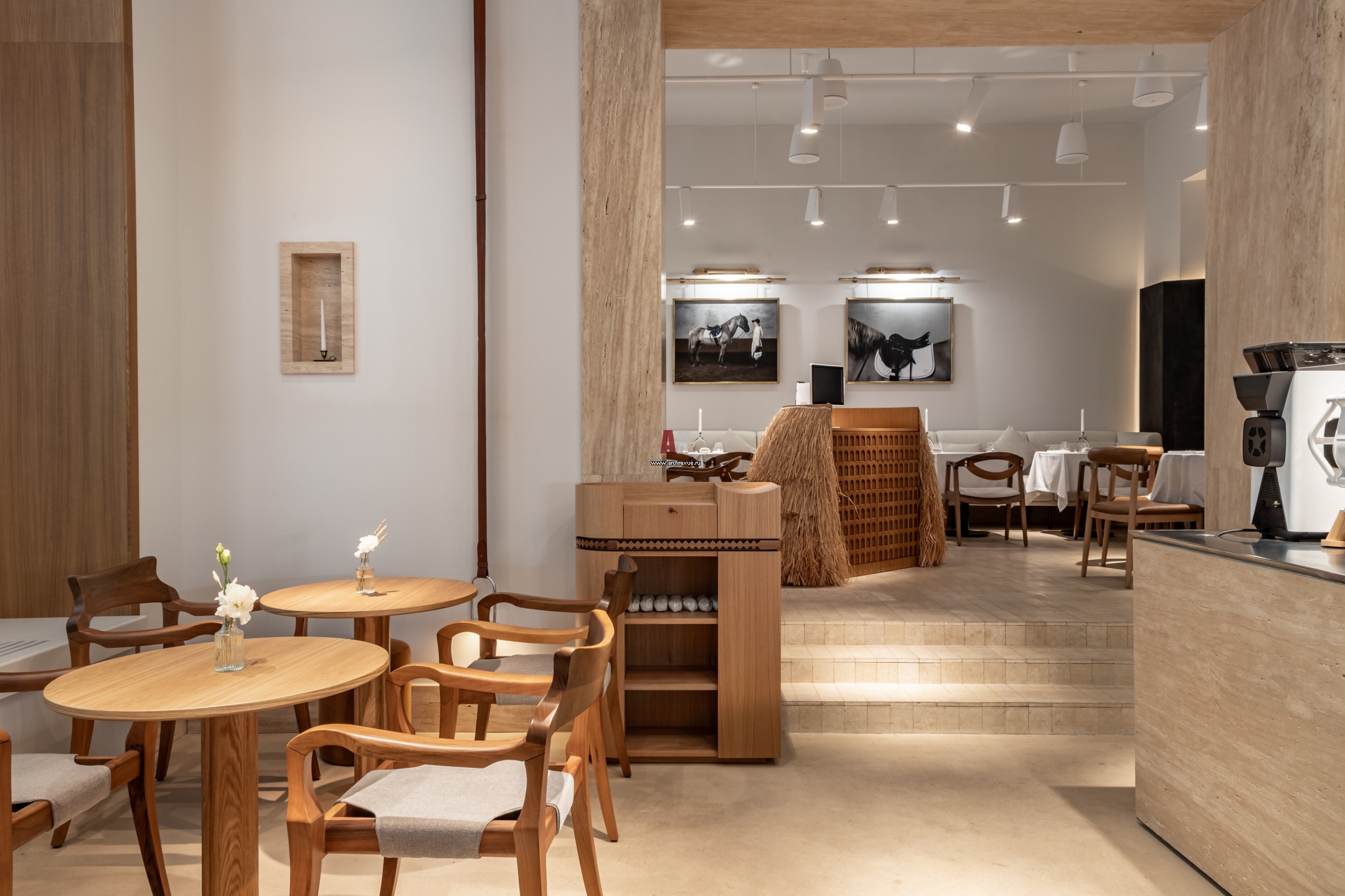 Легкий интерьер, гармонично перекликающийся с архитектурой здания, подчеркивает атмосферу французской кондитерской и одновременно наполнен деталями, отсылающими к усадьбам и лошадям, что не случайно – дизайн создавался по заказу владельцев, любителей конного спорта.