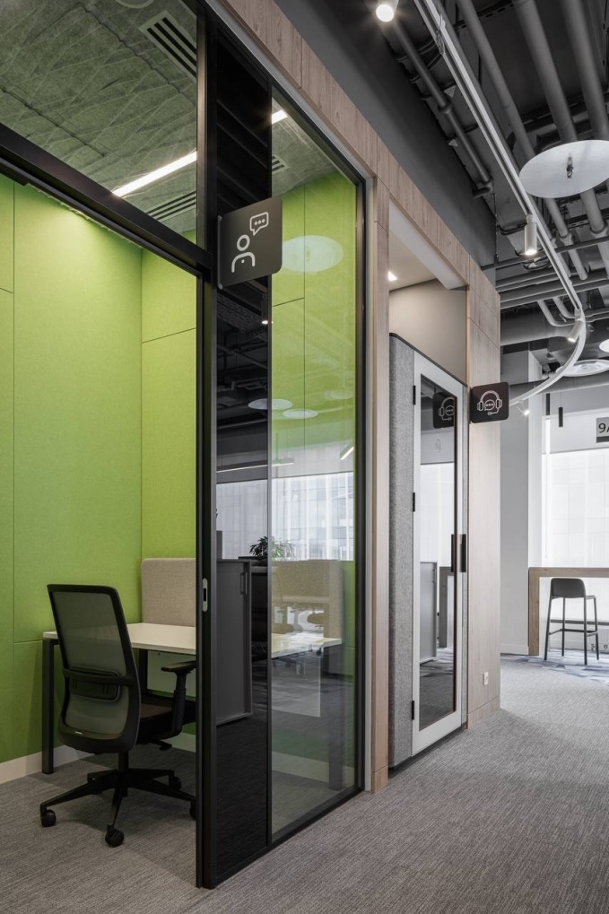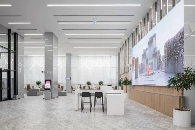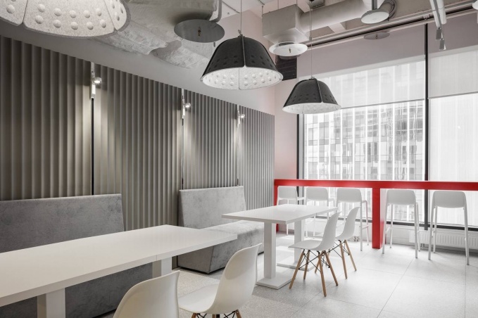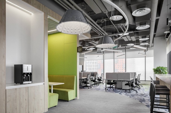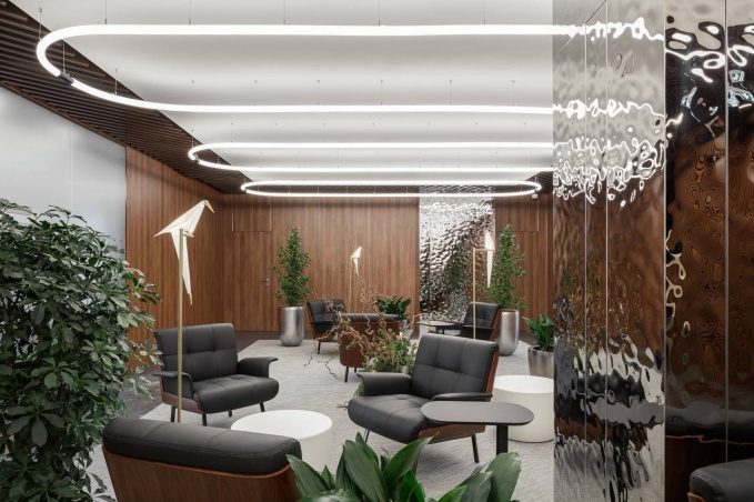 В интерьере офиса отразились ключевые ценности компании: новаторство, функциональность, внимание к деталям и забота о сотрудниках. Это прослеживается в таких решениях как продуманная эргономика, обширный фронт естественного освещения, комфортные санузлы, большое количество кофе-поинтов, помещения для индивидуальной работы разного размера, отделанные звукопоглощающим материалом, климат-контроль во всех помещениях. Внимание было уделено и акустическому комфорту: представительские зоны и весь пятнадцатый этаж имеют специальное акустическое напыление за подвесным потолком.