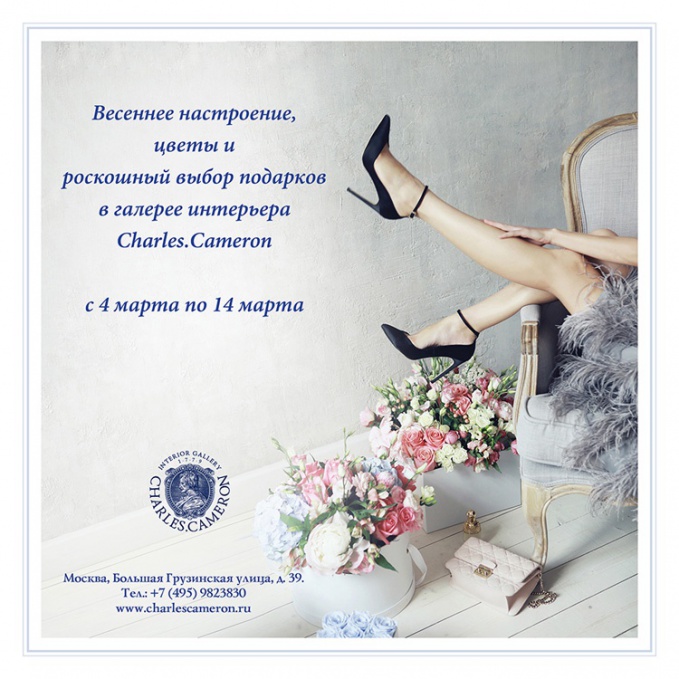 На заповедной территории интерьерного салона Charles.Cameron праздник 8 марта все еще продолжается! В рамках весенней акции, посвященной Международному женскому дню, каждая посетительница салона имеет возможность получить сразу два подарка. Приятный - роскошные благоухающие цветы. Полезный - бесценный совет от высокопрофессиональных дизайнеров Charles.Cameron по вопросу подбора интерьерных аксессуаров.