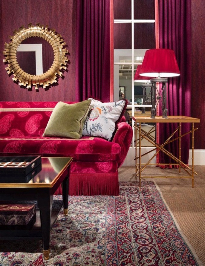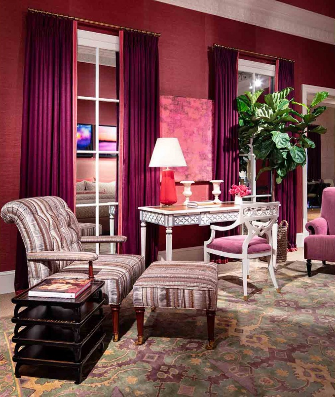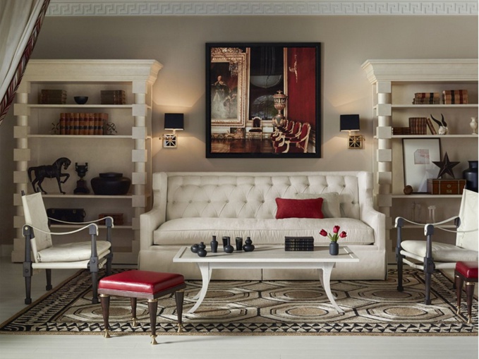 Гостиная в красном цвете – необычное, роскошное и на удивление уютное интерьерное решение. Главное в создании такого камерного классического салона – избежать излишнего дворцового пафоса, в чем помогает колониальная эстетика, а чтобы снизить «кровяное давление», лучше всего использовать теплые оттенки красного – терракотовый, апельсиновый, гранатовый, алый. Дополнительно визуально разгрузить картину помогают светлый паркет, а также контраст черных лакированных и белых матовых поверхностей. Интерьер гостиной набран из мебельной коллекции Alexa Hampton by Theodore Alexander.