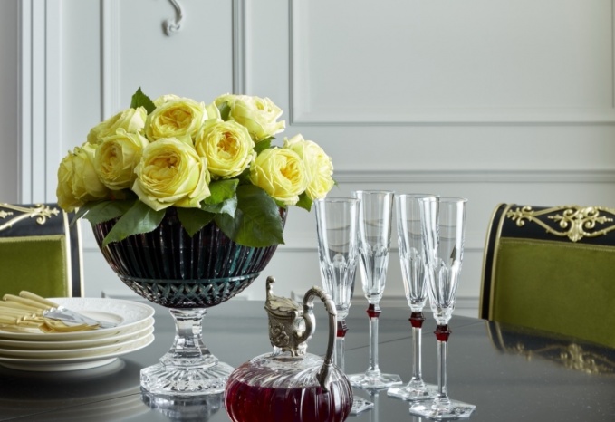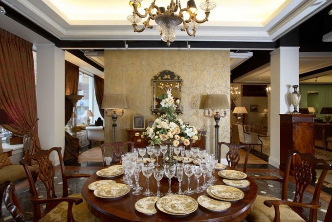 Благородные линии деревянной мебели ручной работы от Titchmarsh & Goodwin, насыщенные оттенки красного и бордового цветов, позолоченные элементы декора задают этой экспозиции столовой тон настоящего торжества. «Инкрустации» на полу, имитирующие световые блики, шелковые вышивки портьер и витиеватые обойные узоры немного смягчают парадную строгость интерьера. Не меньшую роль в деле создания атмосферы подлинного аристократизма в столовой играет и сервировка стола.