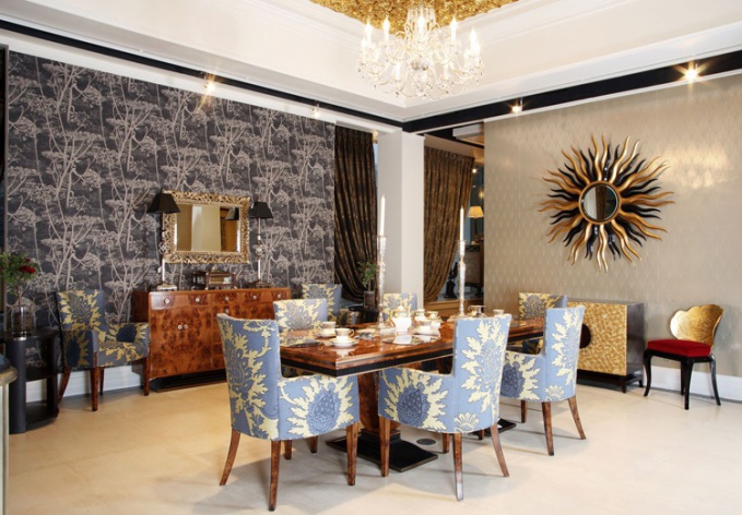 Ар-деко называют стилем кинозвезд и миллионеров. Он самый роскошный и вместе с тем функциональный и комфортный из тех, что существовали в мировой культуре. Пример тому –экспозиция парадной столовой в стиле ар-деко, представленная в интерьерной галерее Charles.Cameron. Для ее создания дизайнеры салона использовали лучшие образцы мебели из древесины редких сортов с орнаментальным текстилем от ведущих трендовых производителей – Restall Brown & Clennell, Alchymia и других. Нейтральный фон обоев и аксессуары – зеркала, вазы, светильники, подсвечники – не перегружают интерьер и создают точное попадание в блистательную эпоху.