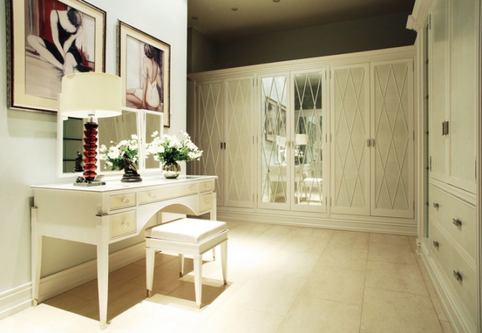 Представленный в галерее Charles.Cameron дизайн-проект гардеробной комнаты отличается безупречным зонированием, аристократичной элегантностью отделки и функциональностью каждой детали. В качестве «базового актива» в гардеробной использованы выполненные на заказ элитные встраиваемые шкафы-купе от Smallbone of Devizes с роскошными финишами из серебра и перламутра, пергамента и штучной шагреневой кожи. Нежные пастельные тона визуально увеличивают пространство и вместе с тем создают ощущение домашнего уюта. В качестве ярких акцентов – тематические живописные полотна на стенах.