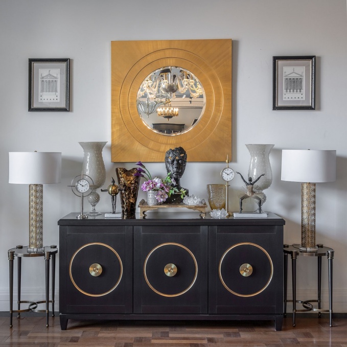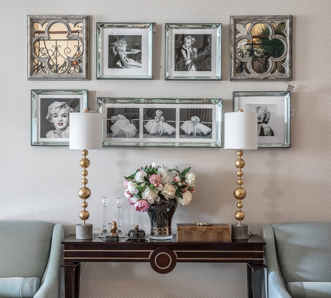 Эта дамская композиция, которая подойдет для гостиной, спальни, будуара, зоны отдыха, также практически полностью сформирована из ассортимента американских интерьерных компаний. Два кресла Cheddock разделены деревянной консолью Theodore Alexander c бронзовым декором, симметрию поддерживают восточные светильники с белыми льняными абажурами от Uttermost. А главная изюминка композиции это, конечно, подборка черно-белых фотопортретов Мэрилин Монро в сочетании с винтажными зеркалами «трефовой масти», которые создают «роковой» эффект игрального салона – стильный контраст с общей атмосферой классической буржуазной благопристойности.
