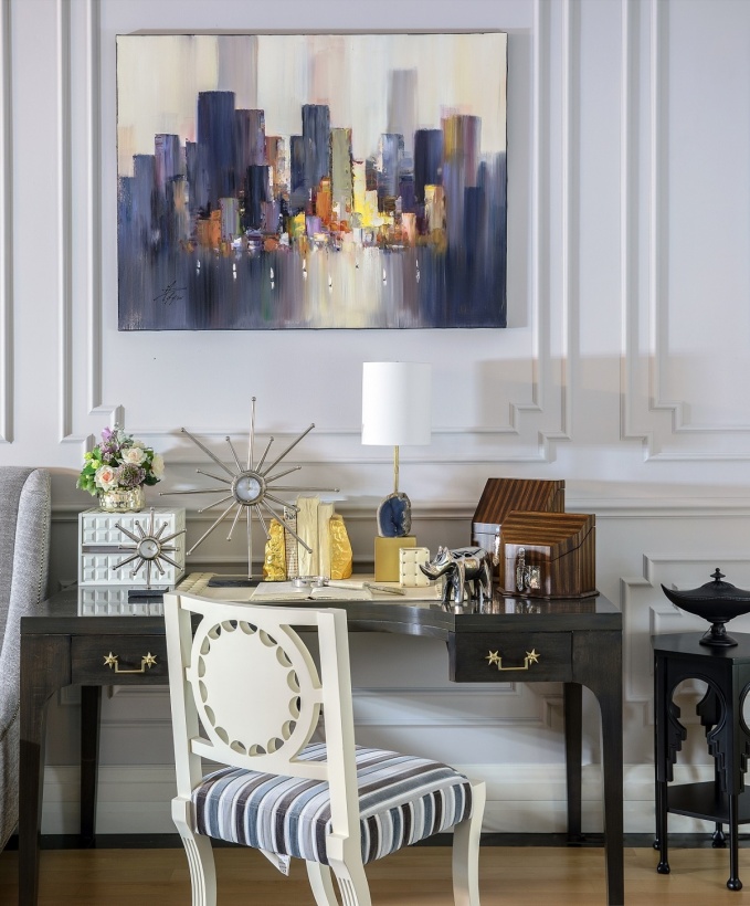 Стильный рабочий уголок для гостиной или дамского будуара. Интерьерная композиция в стиле современного ар-деко набрана из мебели, светильников и аксессуаров известных американских брендов. Письменный стол из темного дерева, белый стул с полосатой обивкой – Chaddock, настольная лампа с основанием из ботсванского агата – Regina Andrew, аксессуары - Global Views, настенный декор – стилизованный городской пейзаж итальянского автора от бренда Ameye. Дизайнерская композиция решена на контрасте светлых и темных тонов с модными металлическими акцентами.