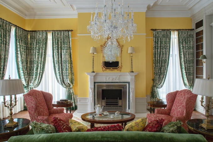 Этот городской особняк в Санкт-Петербурге вполне может служить иллюстрацией для образовательного курса по оформлению классических интерьеров в традиционном английском стиле. Одна из ключевых примет – разнообразие тканей с растительным и в частности цветочным орнаментом, причем это касается и штор, и мебельной обивки, и декоративного текстиля. Что характерно, в проекте использовались ткани и мягкая мебель преимущественно британских брендов. Так, например, в гостиной в контексте традиционных желтых стен тон задают зеленые портьеры с бахромой Watts of Westminster. В спальнях настроение сада в цвету создают шторы Sanderson.