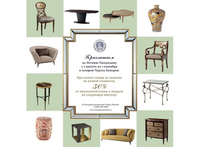 Конец лета – это всегда фейерверки акций, фонтаны скидок и круговерть распродаж. Всем, кто не хочет остаться в стороне от этого праздника жизни, самое время поспешить на мебельную распродажу в интерьерный салон Charles.Cameron и приобрести самую элитную мебель по самым привлекательным ценам. В распродаже участвуют более 70 наименований мягкой и корпусной мебели (диваны, кресла, кровати, комоды, обеденные группы, журнальные столы и т.д.), светильников (люстры, торшеры…), аксессуары и предметы интерьера от лучших мировых дизайнеров.