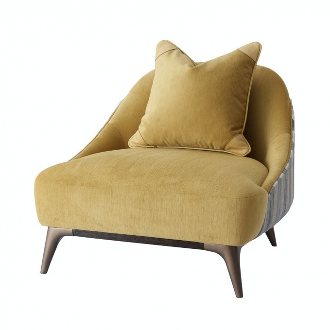 При всей своей сдержанности и нейтральности коллекция Luxury of Serenity имеет чем порадовать любителей ярких акцентов. Впрочем, в исполнении Стива Леунга даже этот яркий акцент смотрится чрезвычайно уравновешенным. Комплект мягкой мебели в обивке стеганым замшевым текстилем приятного желто-горчичного оттенка подойдет для гостиной, кабинета, сигарной или бильярдной комнат. Комплект включает двухместную софу, банкетку и кресло. Деревянные корпусные элементы изготовлены из массива бука, ножки финишированы в двухфазной отделке Cigar Club и Heritage Bronze. Кресло имеет «игривую» комбинированную обивку с полосатым ворсистым текстилем.