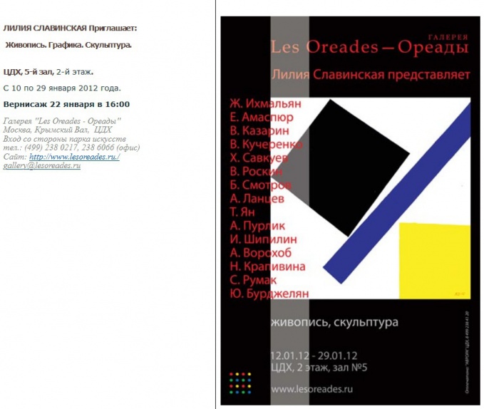 С 22 по 29 января Галерея « Les Oreades-Ореады», поддерживая свою традицию новогодних выставок, предлагает вашему вниманию большую экспозицию сразу в нескольких залах ЦДХ. Основная часть работ располагается в 5 зале на 2-ом этаже. Другая часть общей выставочной программы размещена в 3 зале на антресольном этаже до 26 февраля 2012 года. Для посещения выставки достаточно просто распечатать билет. Ждем вас.