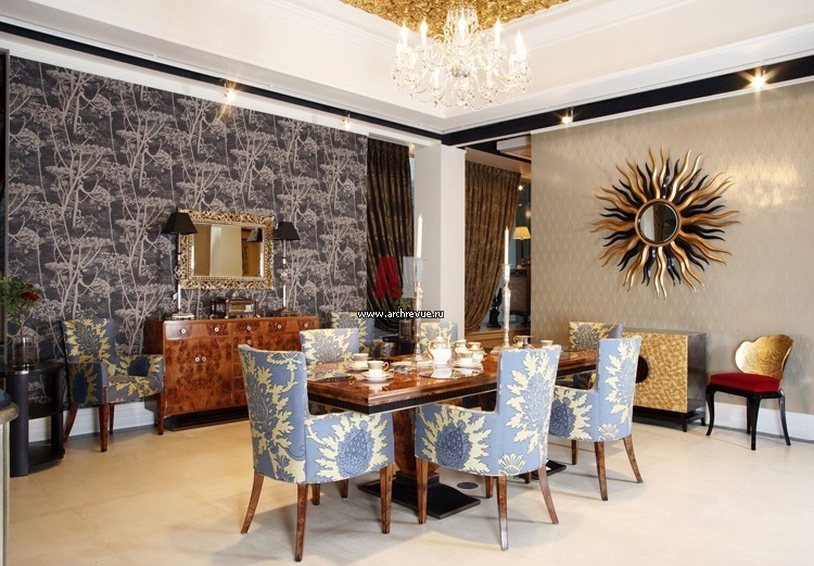 Дизайн интерьера столовой в стиле ар-деко. Стулья и стол из ореха со сложным рисунком Restall Brown & Clennell. Подсвечники из хрусталя авторской работы Mario Cioni. Лампа-светильник Porta Romana. Обои Cole & Son c ручной печатью