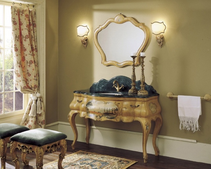 Ванная комната в классике под ключ – так коротко и ёмко можно обозначить миссию итальянского бренда Mobili Di Castello. Сантехника, мебель, смесители, аксессуары – в ассортименте компании представлено все, что необходимо для комплектации санузлов в элитных частных интерьерах. А вот где настоящий простор для исторической фантазии – это выбор стилей! Разнообразие базовых экспозиций Mobili Di Castello (тумба+раковина+зеркало) позволяет заглянуть в самую глубину классической традиции. Здесь представлены различные этнические, национальные, географические стили, дрейфующие в границах классики. Среди наиболее востребованных – английский, средиземноморский. Но есть и пряная экзотика – например, экспозиция, выполненная во французском стиле образца Галантной эпохи.