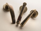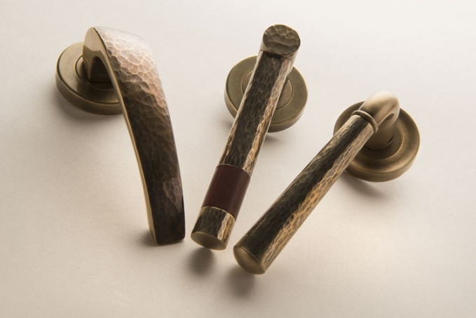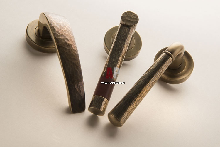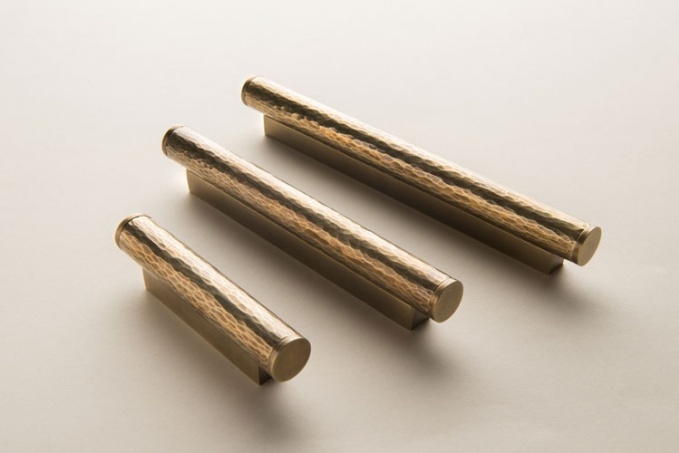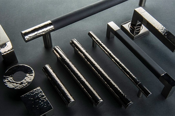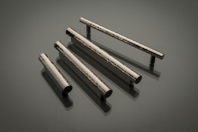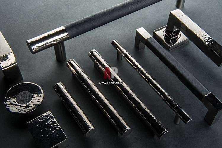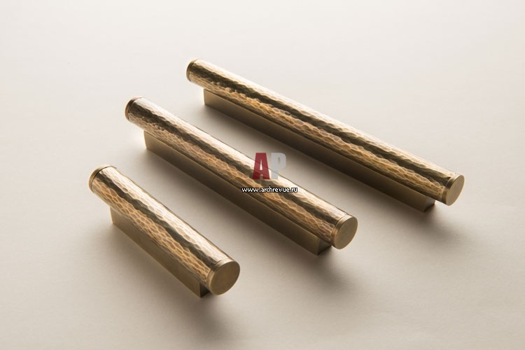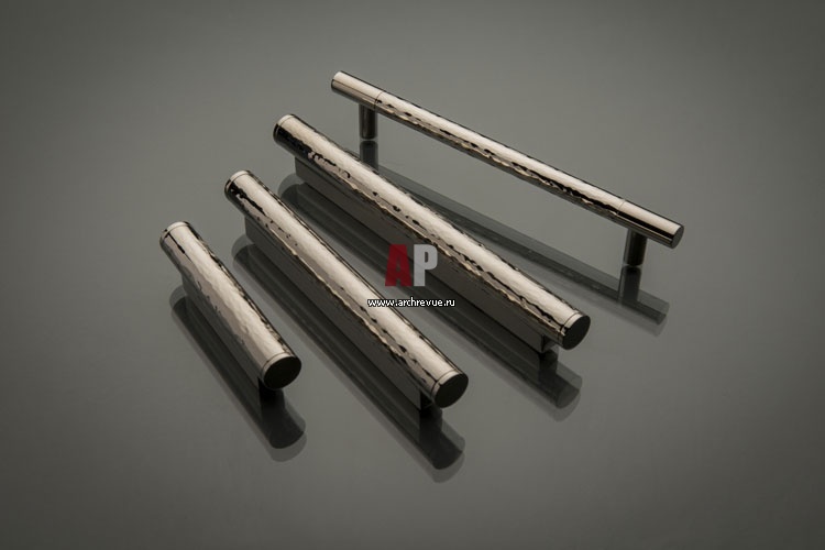 Фурнитуру английского бренда Turnstyle Designs без преувеличения можно назвать отдельным видом декоративно-прикладного искусства, поставленным на службу интерьерному дизайну. В частности серия ручек Hammered – прекрасный образец мастерства художественной обработки металла, а именно латуни. Для создания органического рельефа на поверхности рукоятей и других элементов используется старинная технология ручной чеканки. На рельефную поверхность дополнительно наносятся декоративные финиши, которых насчитывается более десяти, включая покрытие из натурального перламутра.