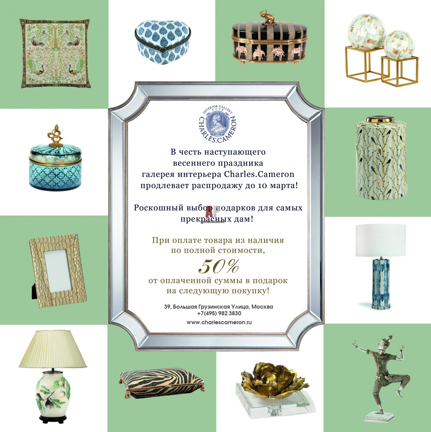 Под занавес зимнего сезона галерея Charles.Cameron на Большой Грузинской радует выгодным предложением на приобретение мебели, светильников и интерьерных аксессуаров. При покупке акционных товаров из наличия – 50% скидка на следующую покупку. В каталоге акции представлен большой выбор тумб и консолей, предметы из авторской коллекции американского дизайнера Алексы Хэмптон, а также несколько мебельных шедевров в азиатском стиле с изысканной ручной росписью, например, роскошный секретер. Предложение действительно до 10 марта включительно.