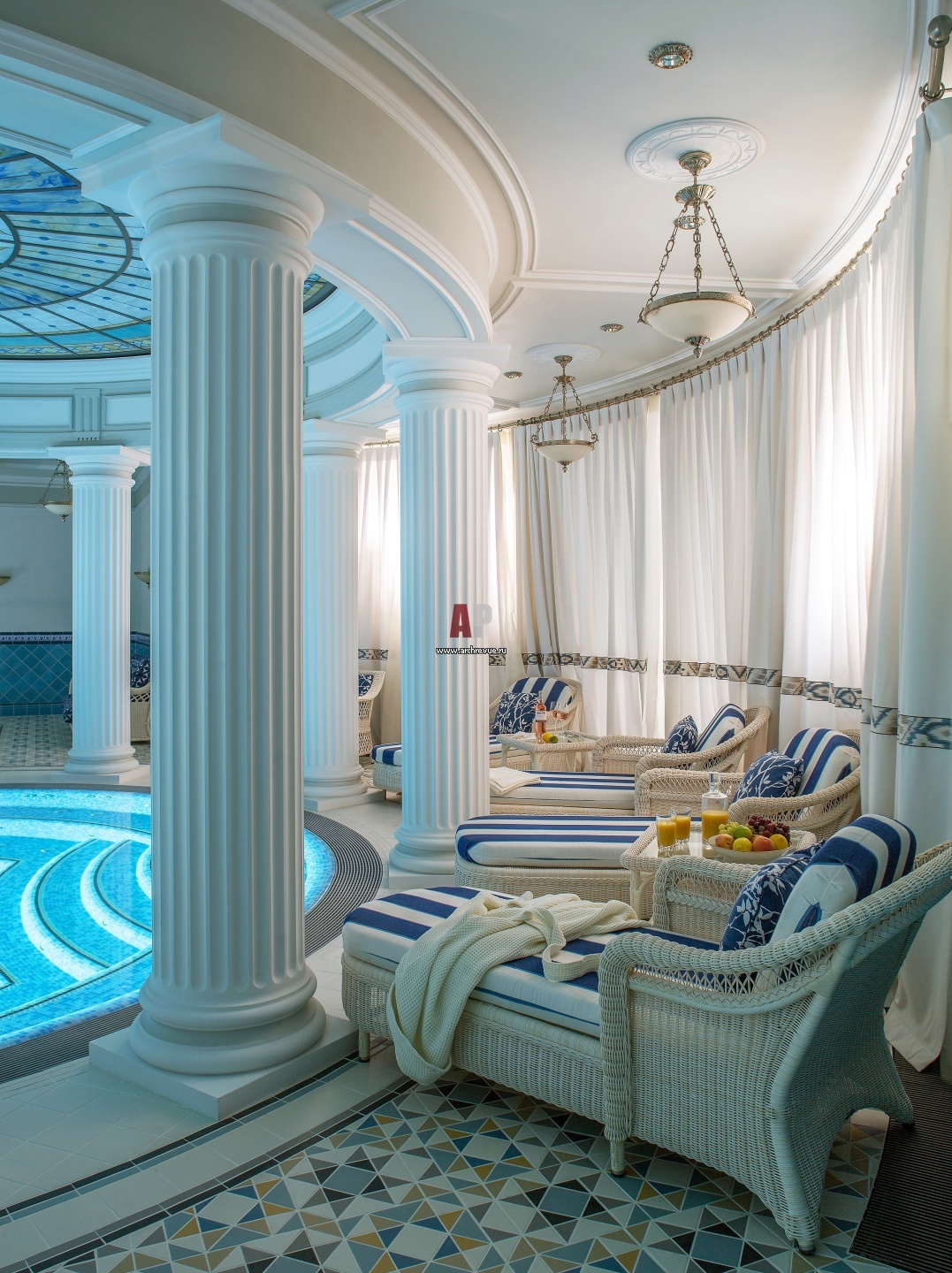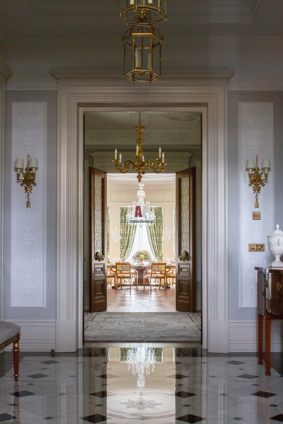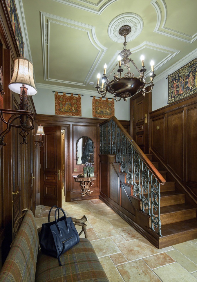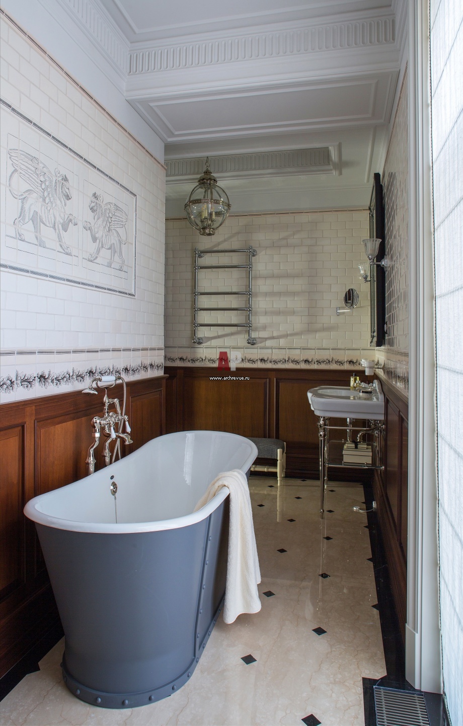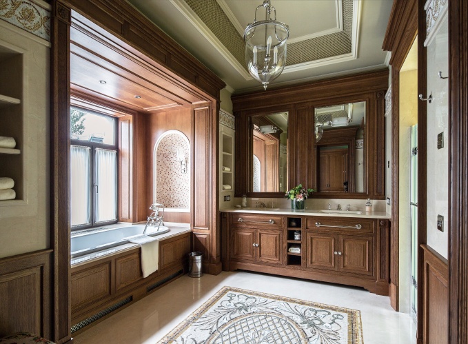 Комплексный интерьерный проект подразумевает поставку всех отделочных материалов, и этот классический городской особняк в Санкт-Петербурге может служить образцом творческого использования отделочных материалов из натурального камня и керамики. Так, например, пол входной зоны и кухни оформлен брашированными плитами из травертина в нерегулярной раскладке, что создает винтажный эффект. Центральный холл и часть санузлов, выполненных в имперском стиле, оформлены натуральным мрамором с коврами из мраморной мозаики. Чаша бассейна по традиции уложена стеклянным мозаичным миксом. В интерьере также использовано несколько видов английской керамической плитки для пола и стен с декоративными бордюрами.