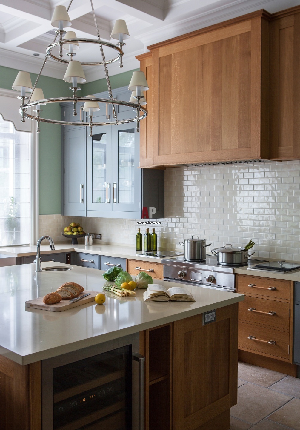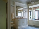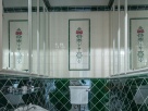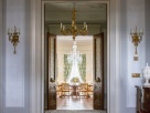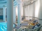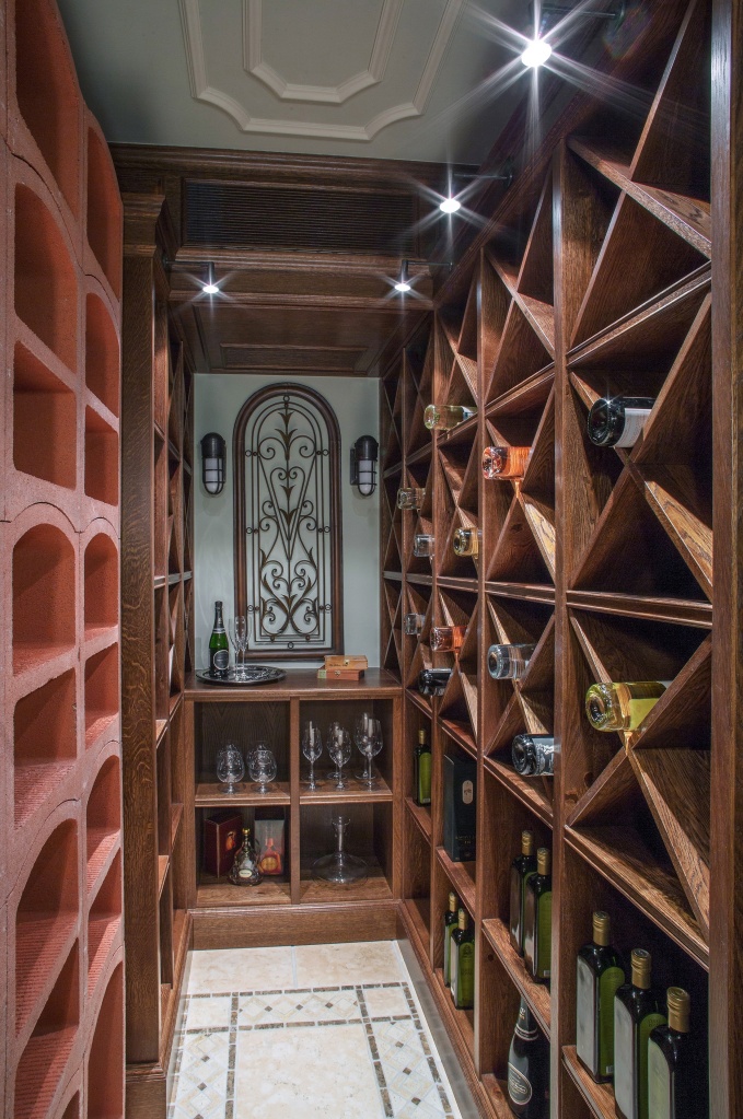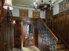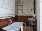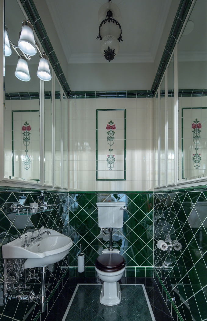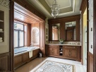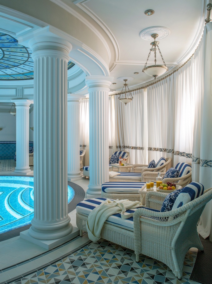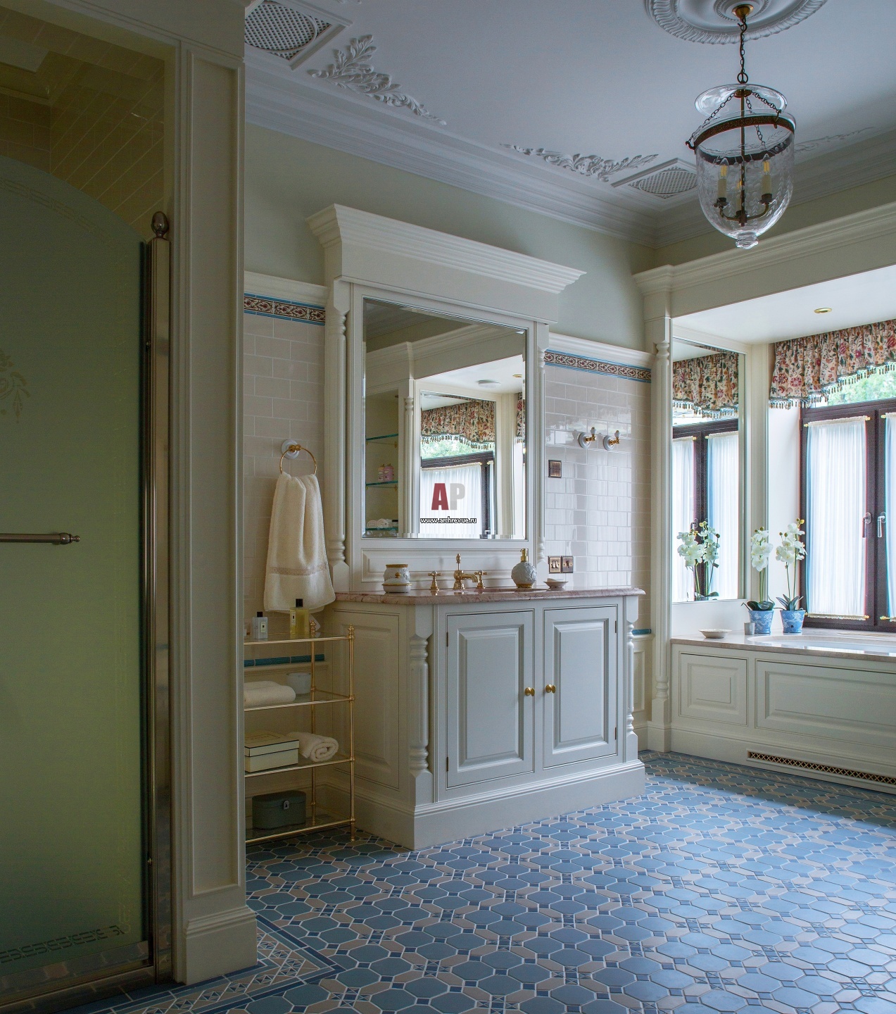Комплексный интерьерный проект подразумевает поставку всех отделочных материалов, и этот классический городской особняк в Санкт-Петербурге может служить образцом творческого использования отделочных материалов из натурального камня и керамики. Так, например, пол входной зоны и кухни оформлен брашированными плитами из травертина в нерегулярной раскладке, что создает винтажный эффект. Центральный холл и часть санузлов, выполненных в имперском стиле, оформлены натуральным мрамором с коврами из мраморной мозаики. Чаша бассейна по традиции уложена стеклянным мозаичным миксом. В интерьере также использовано несколько видов английской керамической плитки для пола и стен с декоративными бордюрами.