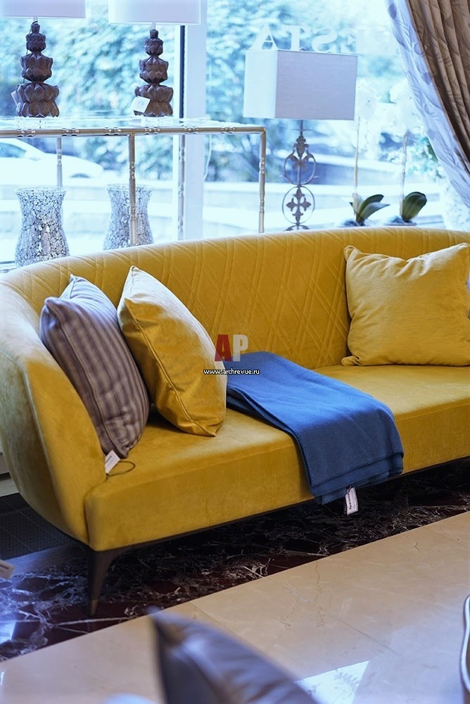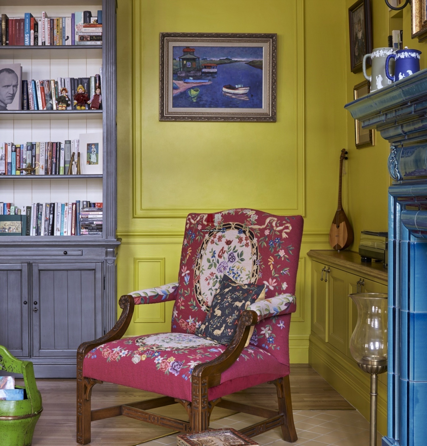 Горчичный цвет в интерьере квартиры. Автор проекта – Олимпиада Арефьева. Кресло в каминной – поставщик Галерея интерьера Чарльз Камерон. Подробнее об объекте смотрите здесь.