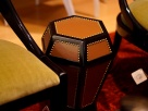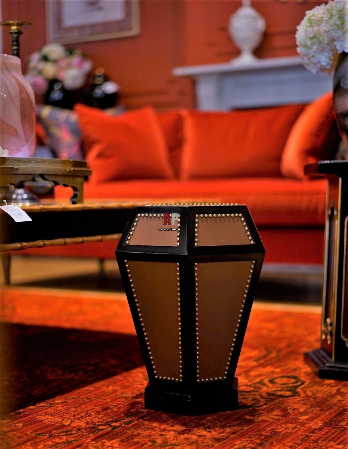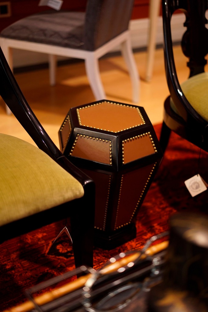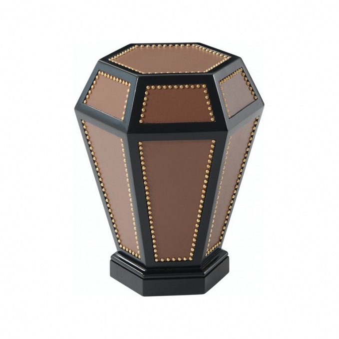 Карамельный шестигранник, он же стол-табурет с прочным каркасом из натуральной древесины обтянут качественной натуральной кожей и декорирован мебельными гвоздиками. Шириной не более 40 см, этот столик относится к категории маленьких, да удаленьких. Он уверенно займет достойное место в гостиной, спальне или кабинете. Высокое качество, стильный современный дизайн, производство США.