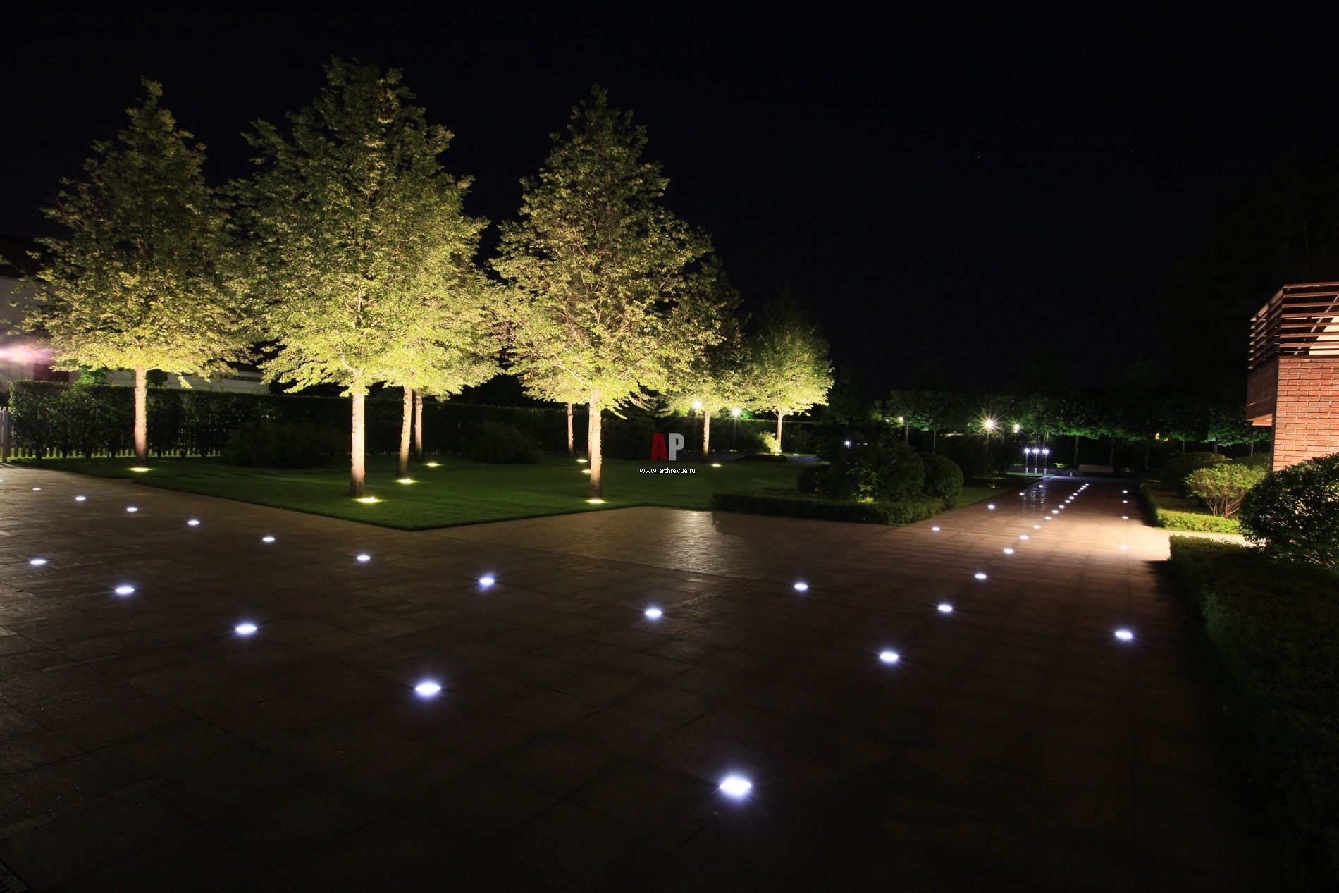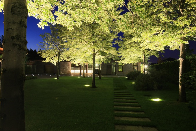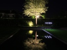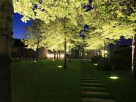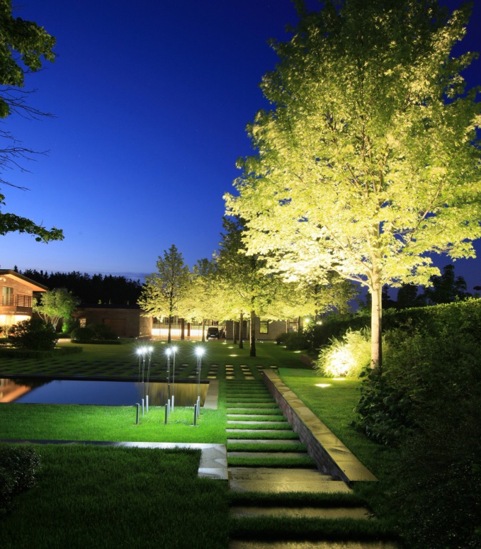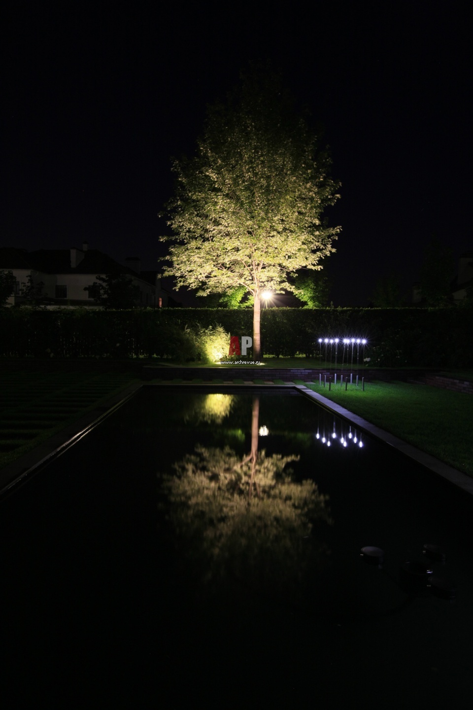 Сад разместился на двух гектарах подмосковной земли. Одним из интересных видов работ в нем стало проектирование ландшафтного освещения. Основной акцент сделан на нижнюю подсветку крупноразмерных деревьев.