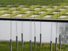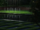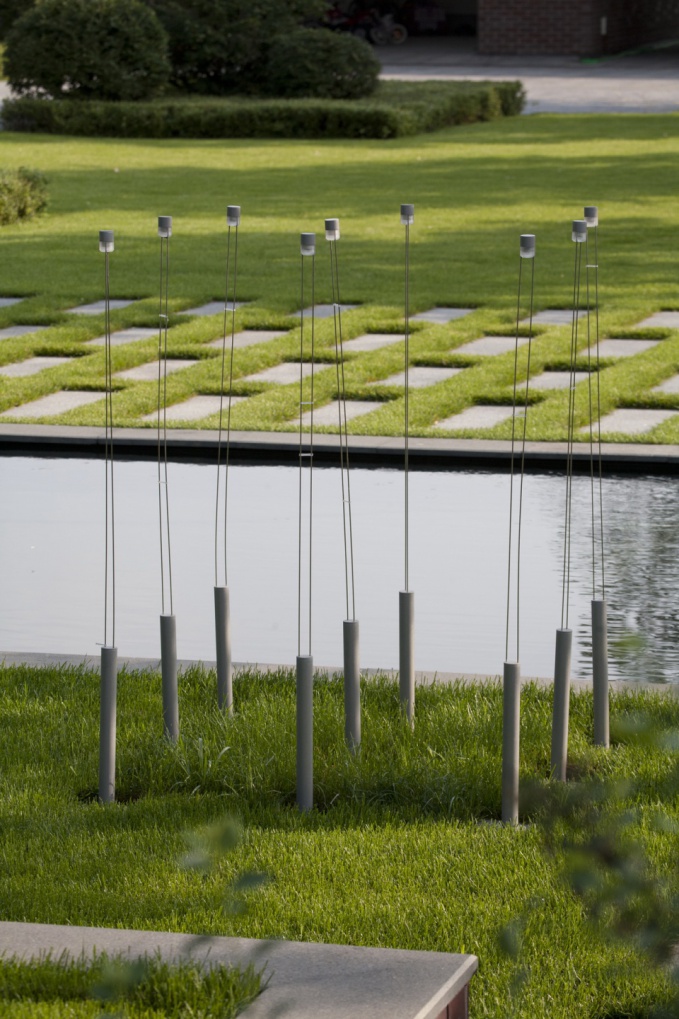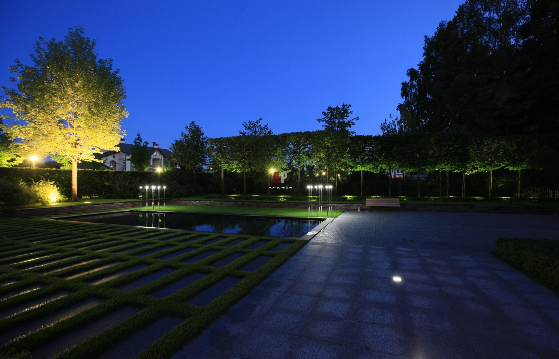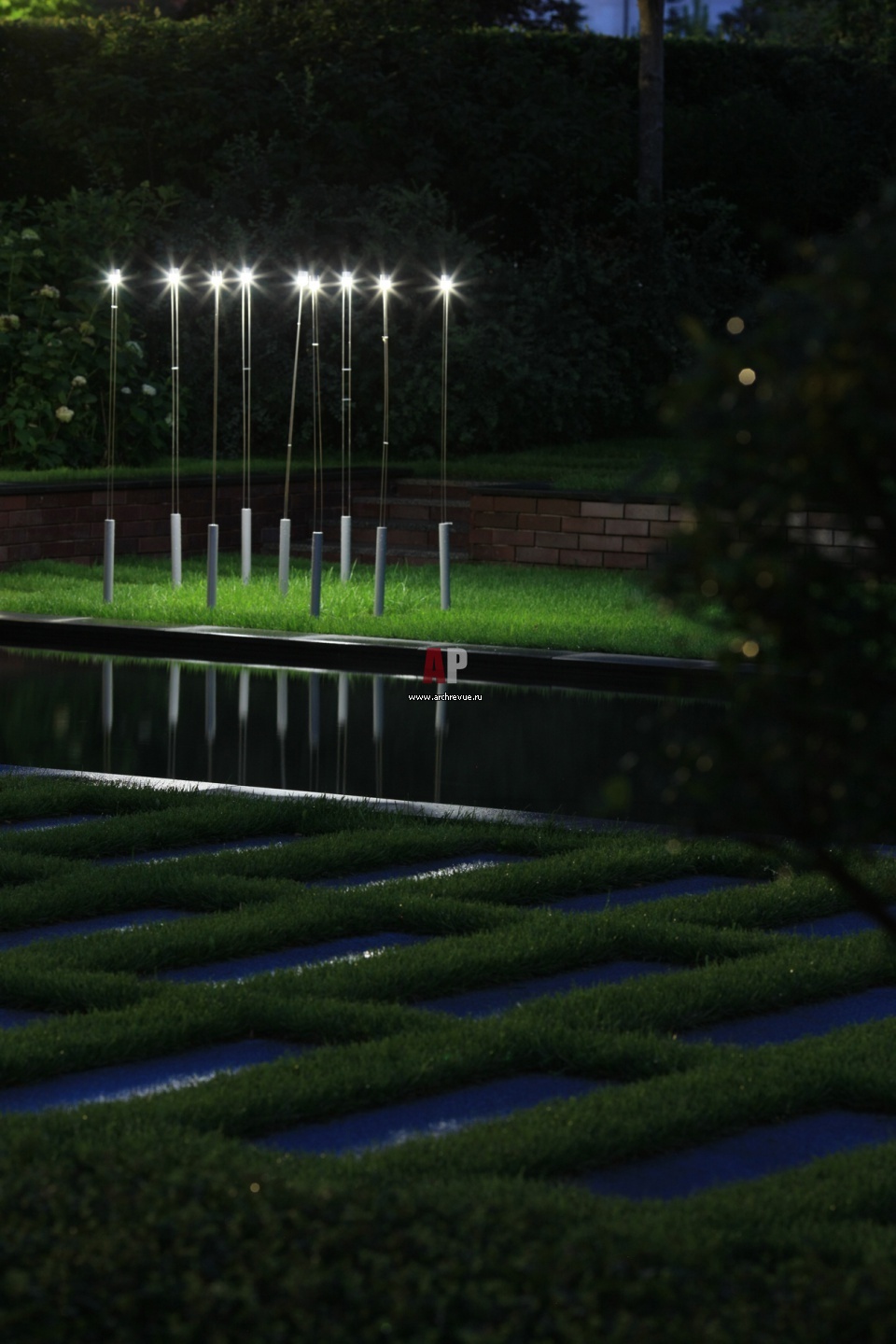 Внимание привлекают минималистичные светильники у водоема, отдаленно перекликающиеся с зарослями камыша. Они расположены в строгом порядке. Своими тонкими вертикальными силуэтами вторят прямым стволам деревьев. Световой проект преображает ландшафт ночью и переключает внимание на детали, незаметные днем.