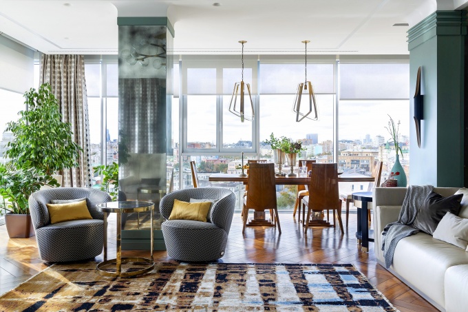 В работу досталось очень сложное пространство – квартира площадью 202 кв. м с нестандартной планировкой, шестиметровыми потолками и радиусным панорамным остеклением. Выбрав столь необычное пространство для жизни, заказчики были открыты к нетривиальным решениям. Дизайнер создала светлый и жизнерадостный интерьер с яркими красками, скульптурной лестницей, и авторской мебелью на грани арта.