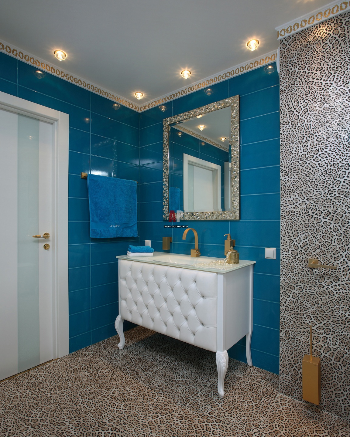 Интерьер женской ванной комнаты в синих тонах. На стенах – анималистическая плитка Horus Art с пятнышками леопарда. Белая тумба под умывальник от Il Tempo Del, передняя панель выполнена из проклепанной кожи с кристаллами Сваровски.