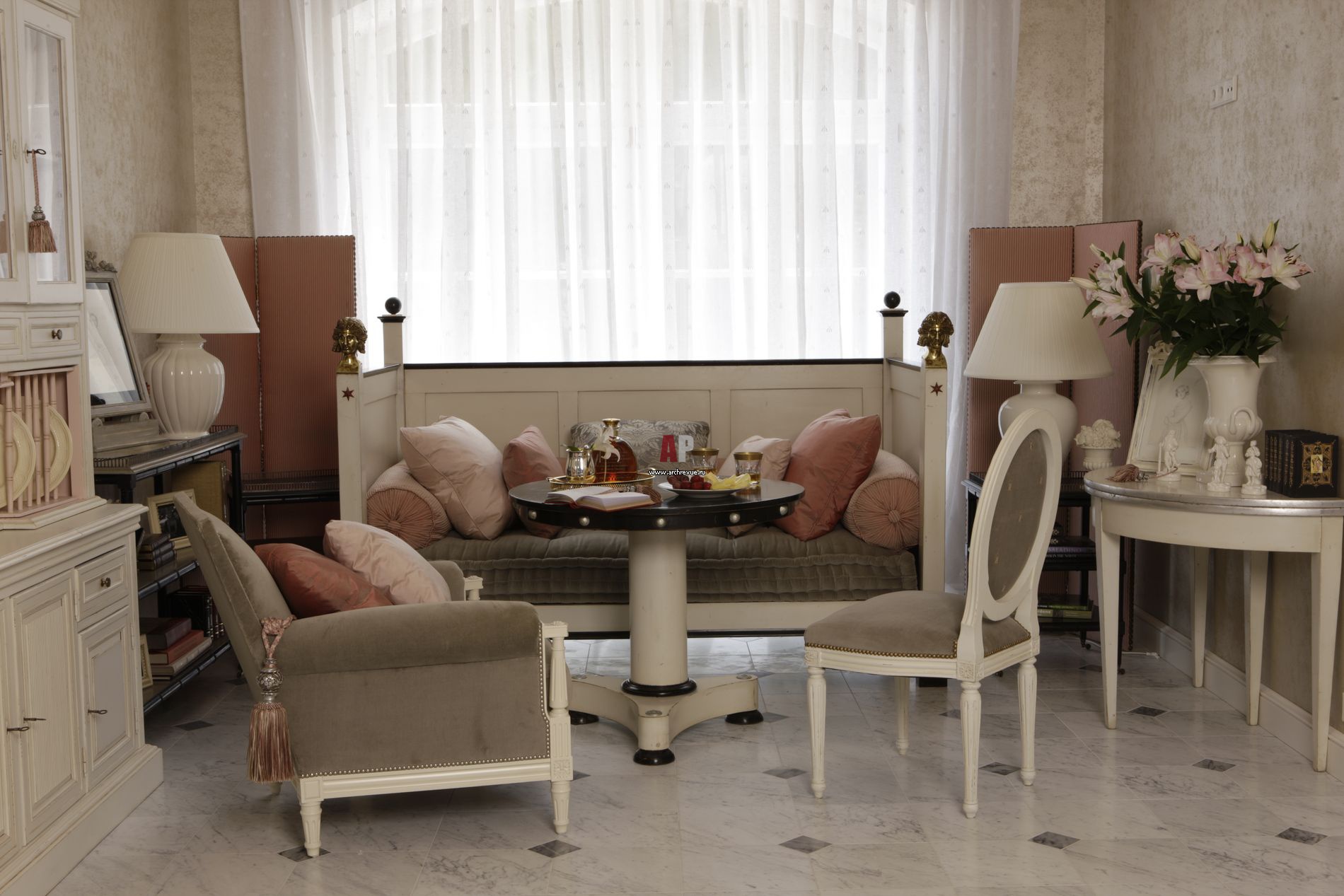 В глубине, ближе к лестнице, помещения располагается так называемая «рюмочная». Это камерная и чрезвычайно уютная зона меблирована диваном и столиком Moissonnier, консолью и буфетом AGR.