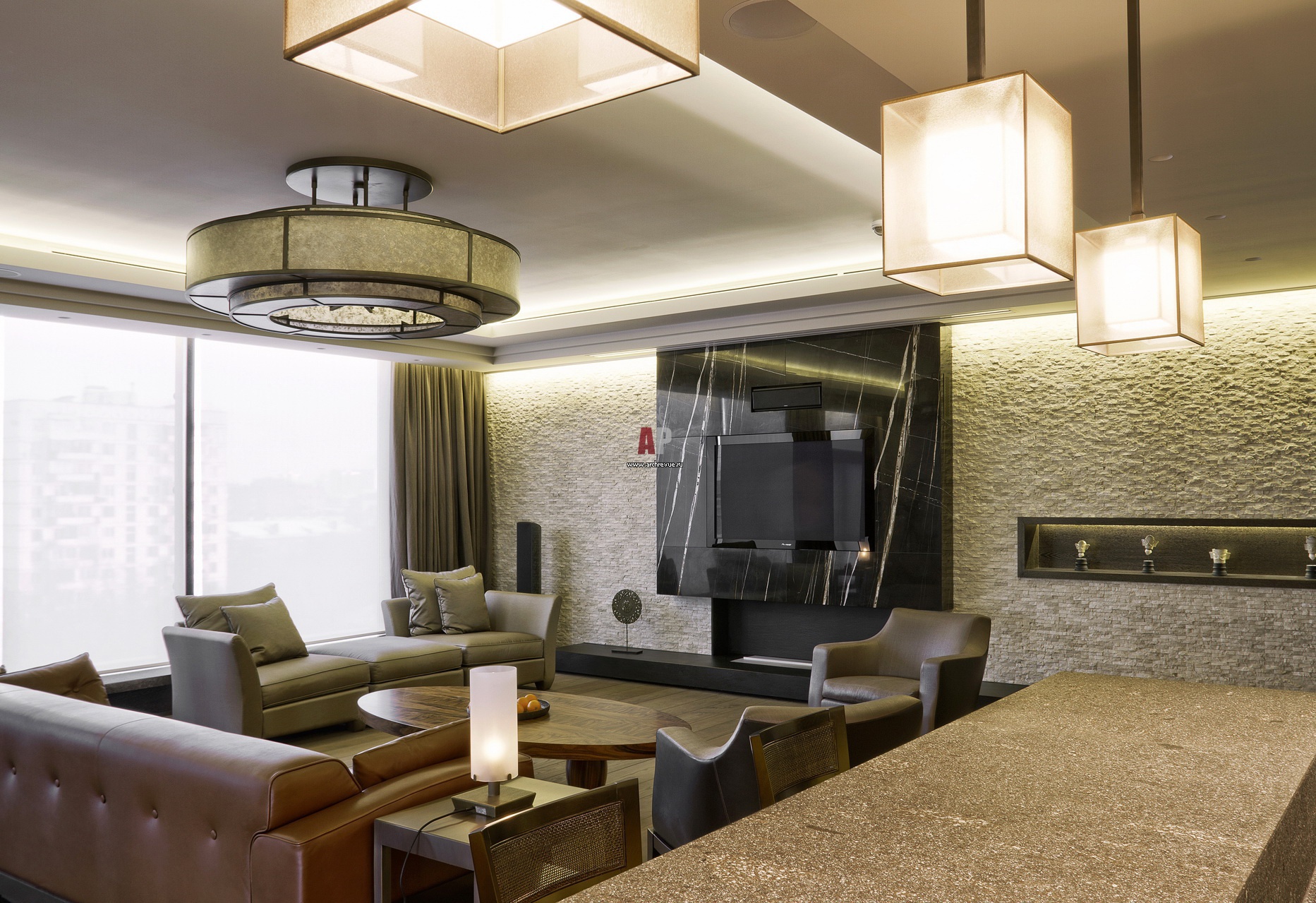 Интерьер студийной гостиной с камином. Портал камина представляет собой плиту из черного мрамора с белыми диагональными прожилками. Сверху в нее встроена плазменная панель, внизу – биокамин с открытым пламенем.