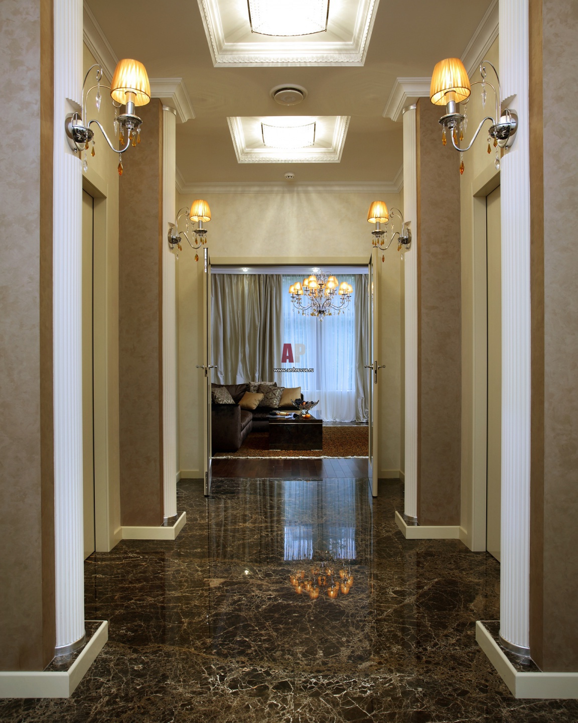 Интерьер парадного холла. На полу в прихожей – слэбы из коричневого мрамора Emderador Dark.