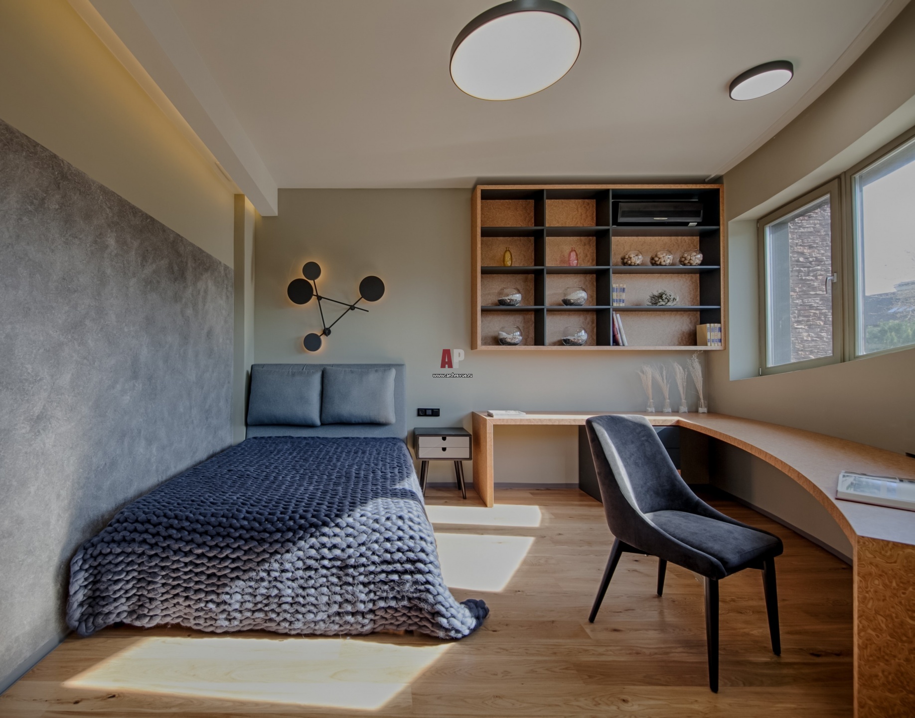 Детская спальня с большим полукруглым окном и рабочим местом, повторяющим изгиб фасада. Кровать, стулья, тумбочка, SK Design. Встроенная мебель сделана на заказ по эскизам архитектора.
