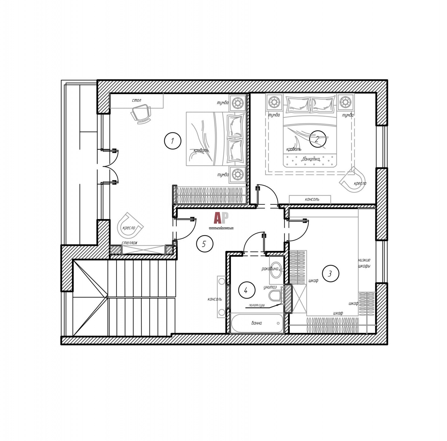 План второго этажа двухэтажного дома с мансардой в Подмосковье. Общая площадь – 220 кв. м.