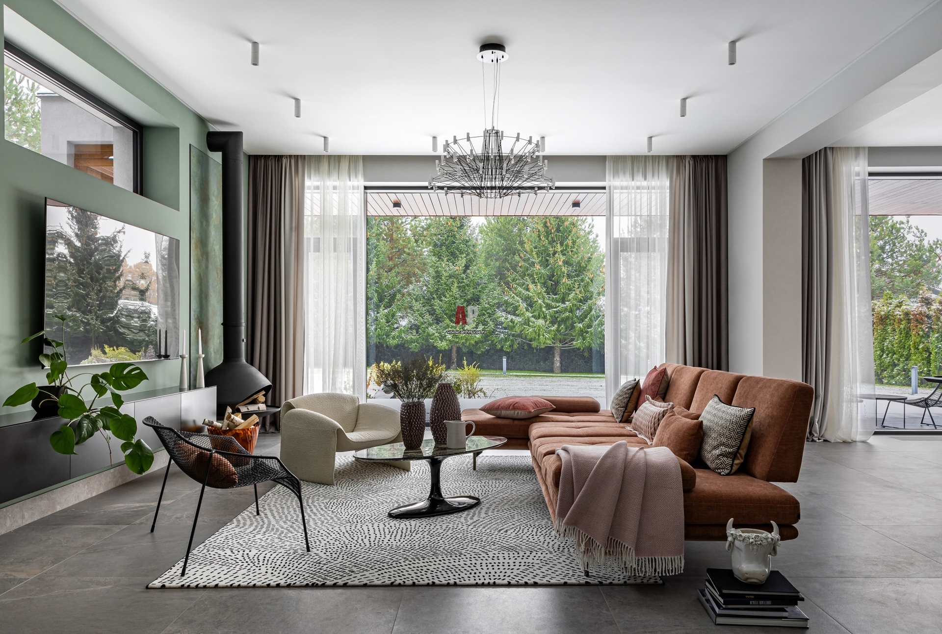 Общая гостиная с двумя откатными дверями-витражами и выходом на террасу. На полу – камень. Светильник из металла с кольцом на 50 свечей, MOOOI, Coppelia.