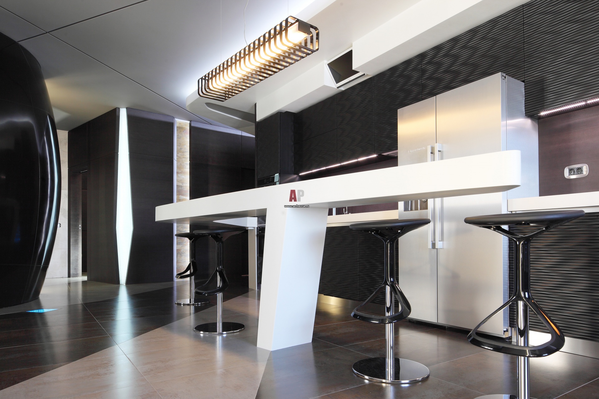 Вместо традиционной столовой в квартире сделана эффектная барная стойка. Барная стойка, искусственный камень Corian, производитель DuPont, на заказ по чертежам архитектора. Стулья, Walter Knoll.