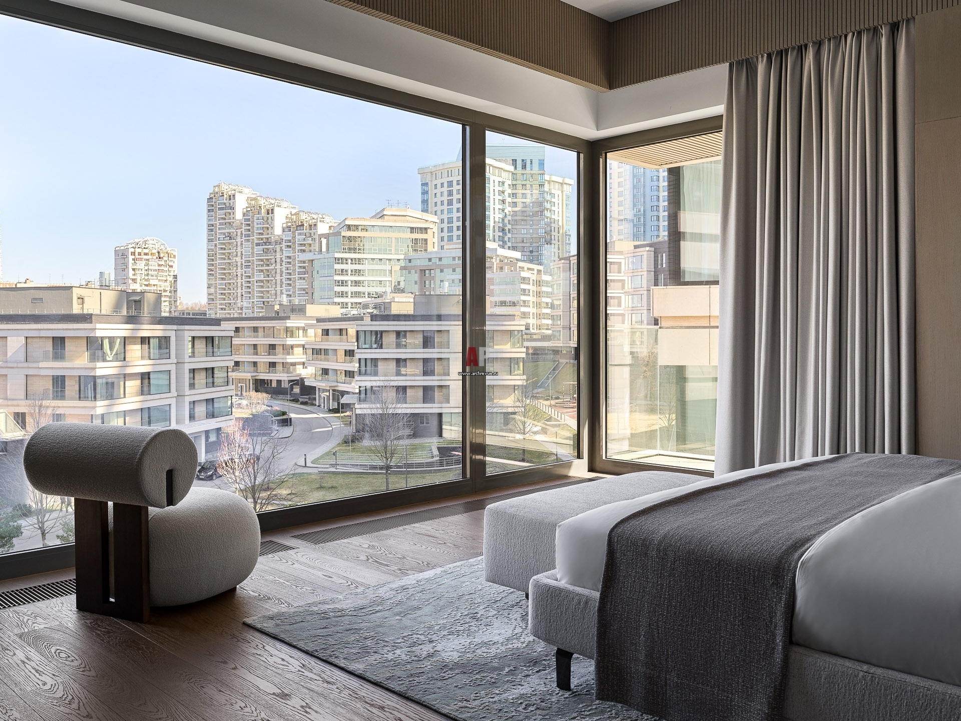 Спальня с угловым панорамным остеклением. Кресло, Norr11, модель Hippo Lounge. Ковер, Art de Vivre.