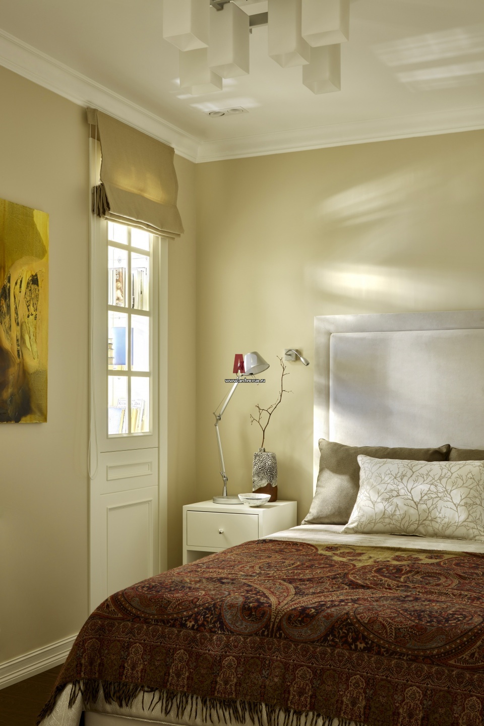 Гостевая спальня не имеет окна, естественный свет в нее попадает через витраж в гостиной. Римские шторы регулируют световой поток и обеспечивают приватность.