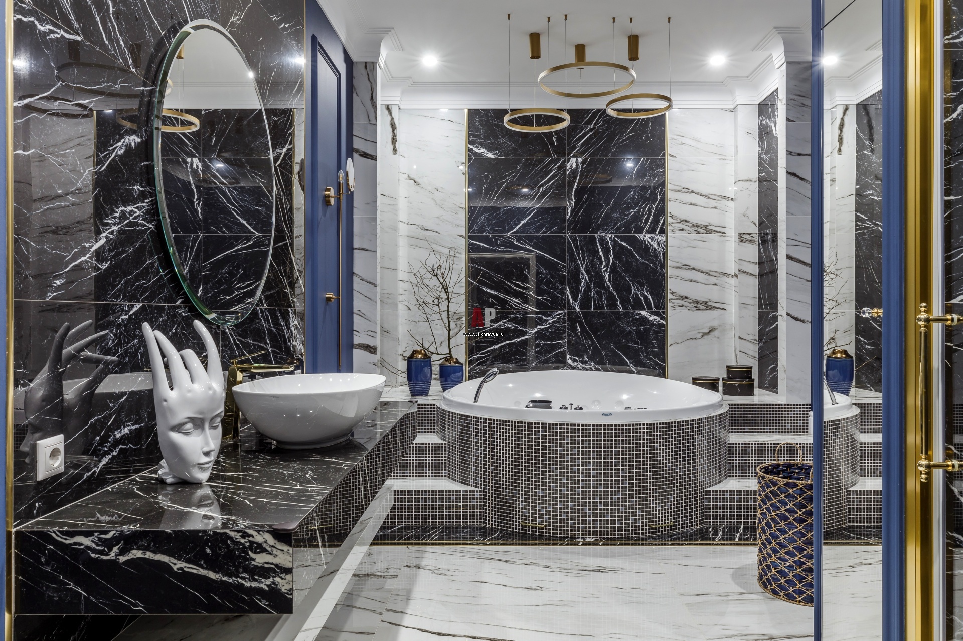 В ванной комнате при спальне хозяев использован керамогранит под мрамор с активной текстурой. Круглая ванна размещена на подиуме.