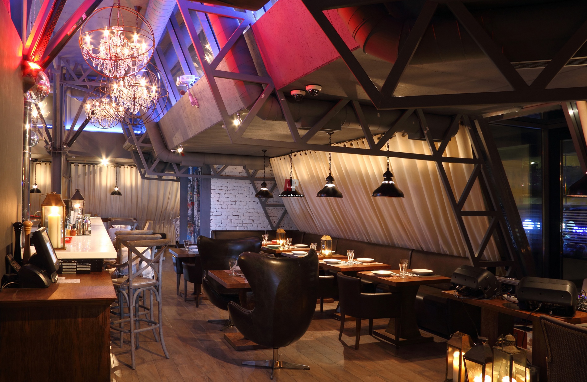 Клубная зона на втором этаже. Индустриальные металлические балки, неоновая подсветка и дизайнерские кожаные кресла создают облик модного заведения в стиле фьюжн.