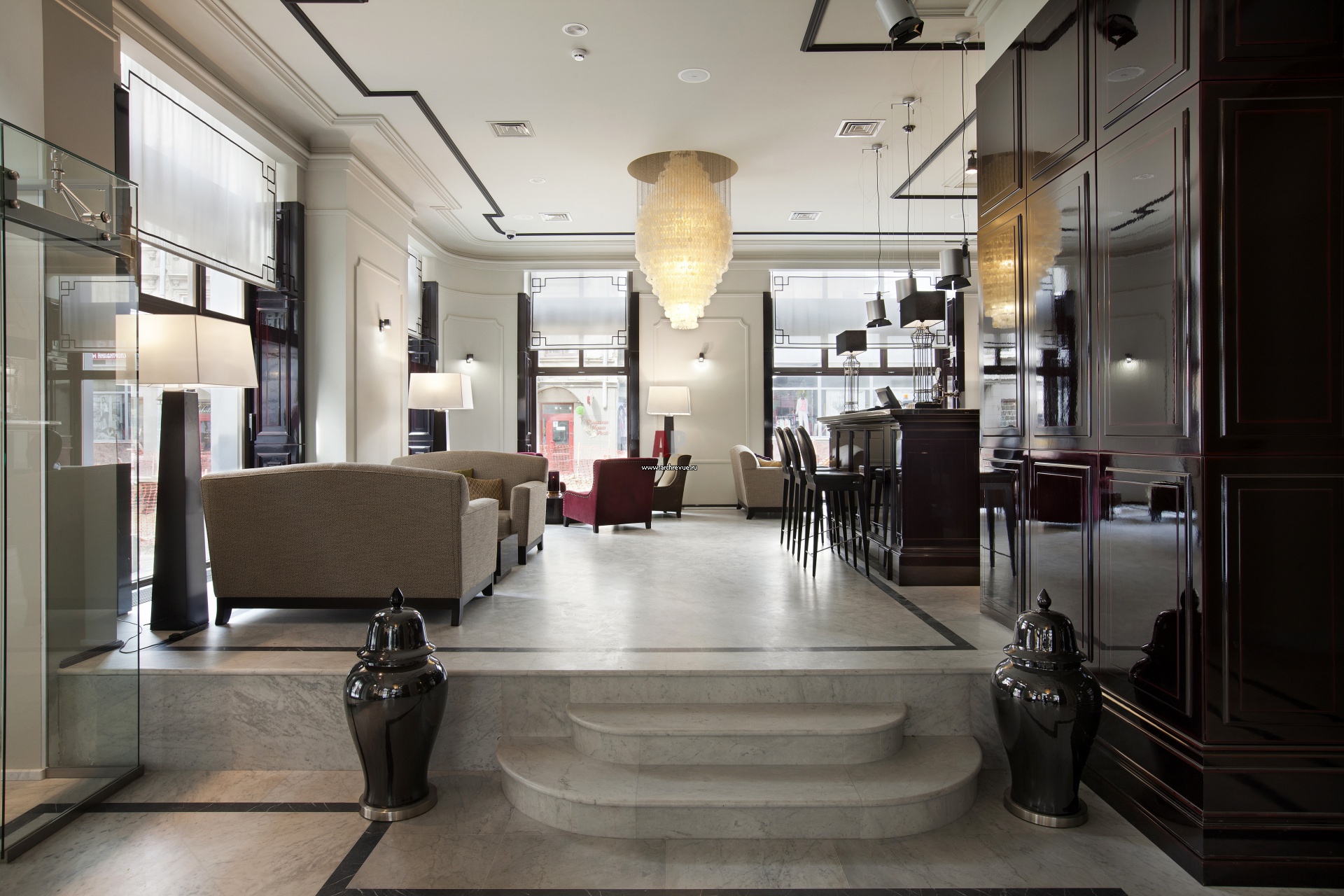 Зона ресепшен расположена на ступень ниже бара и лобби. Полы выложены серым мрамором. Тонкие гипсовые молдинги украшают стены и потолки.