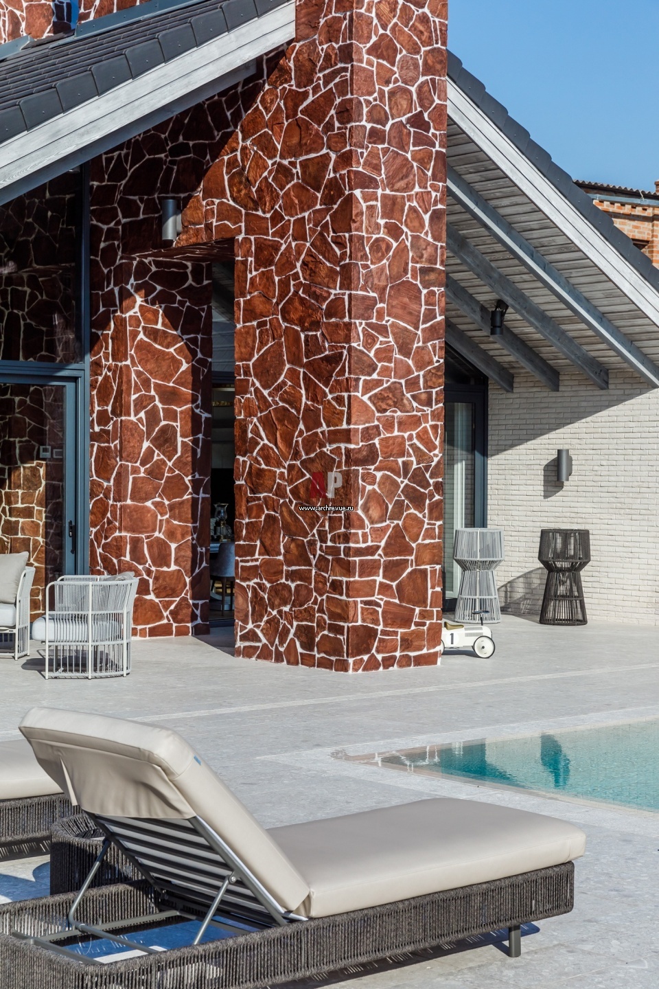 Дом со стеклянным фасадом и двухсторонним камином. Шезлонги, Varaschin.