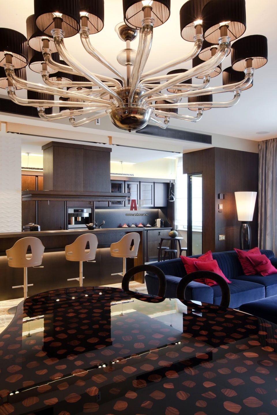 Вид со стороны столовой на кухню. Лакированный обеденный стол Giorgetti с вкраплениями железного дерева. Светильник, Barovier & Toso.
