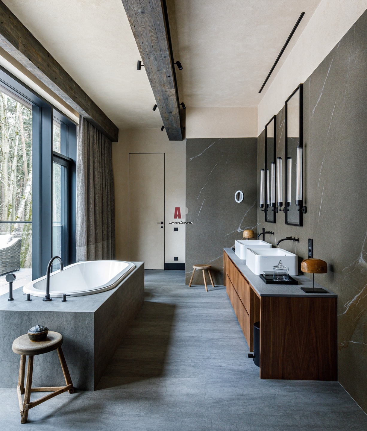 Монохромная ванная комната при мастер-спальне. Серый керамогранит, Arch-Skin. Сантехника, смесители THG.