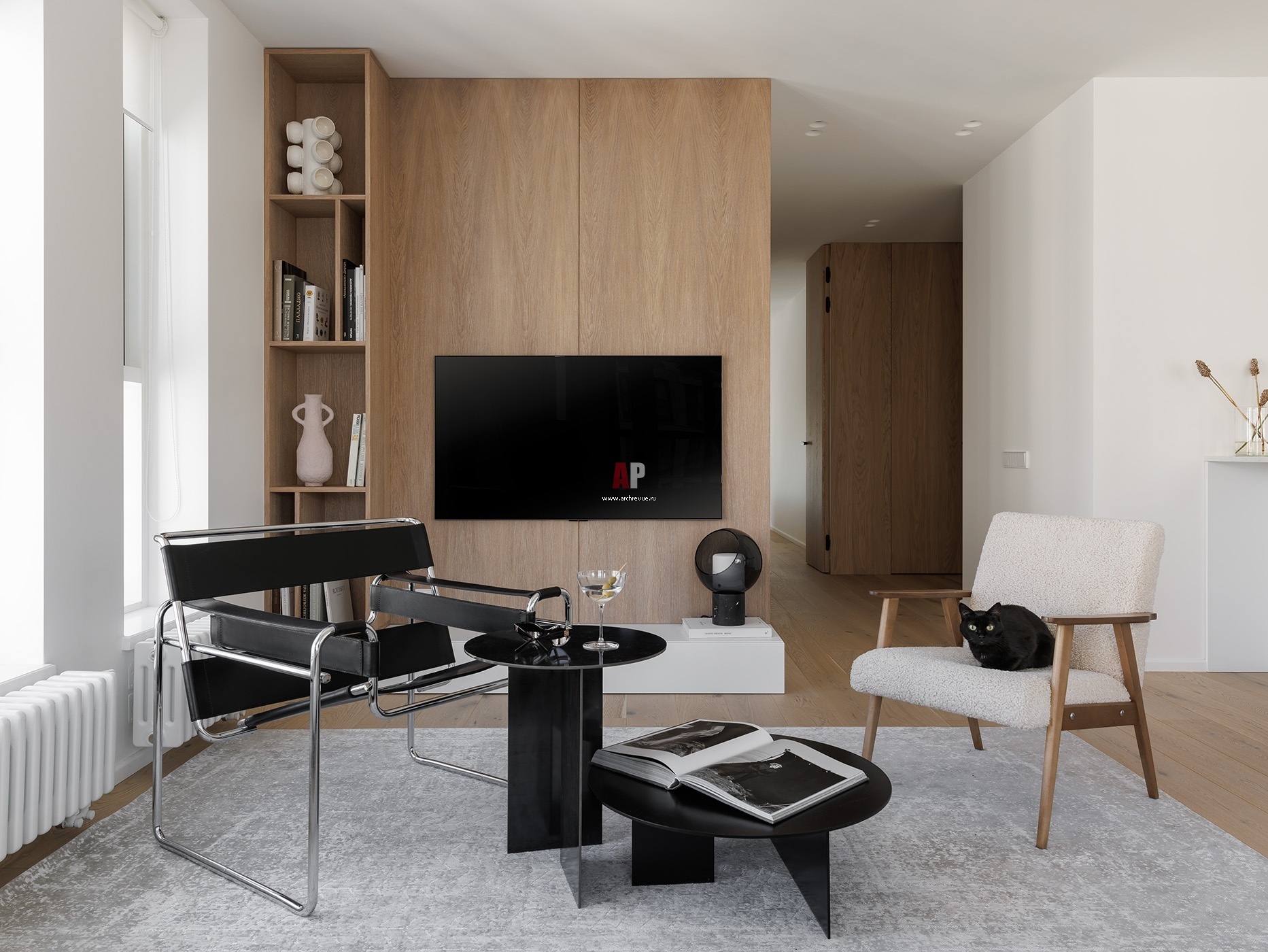 Гостиная. Стеновые панели, шпонированный дубом МДФ под маслом Saicos. Украшение проекта – кресло Walter Knoll, модель Wassily, дизайн Марселя Бройера. Журнальные столики, Ominimalism.