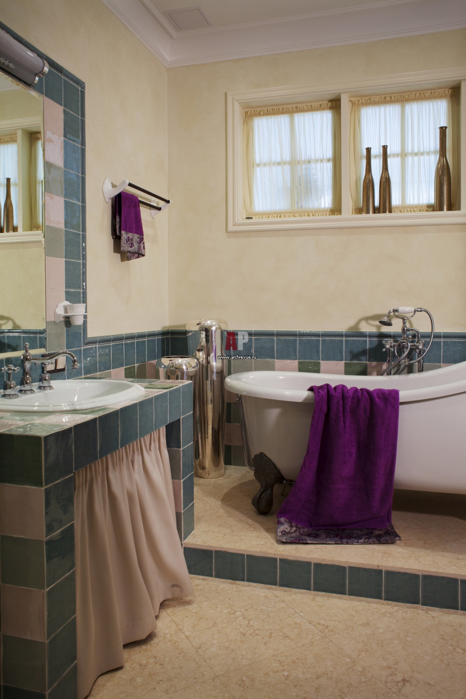Интерьер ванной в стиле Прованс. Расположение спальни и санузлов выбрано по принципам фэн-шуй. Дополнительное окно сделано, чтобы впустить свет в помещение. На подиуме – отдельно стоящая ванна на лапах, фурнитура цвета серебра. Поставщик сантехники, «Интерьерный салон» («Биг Бен»).