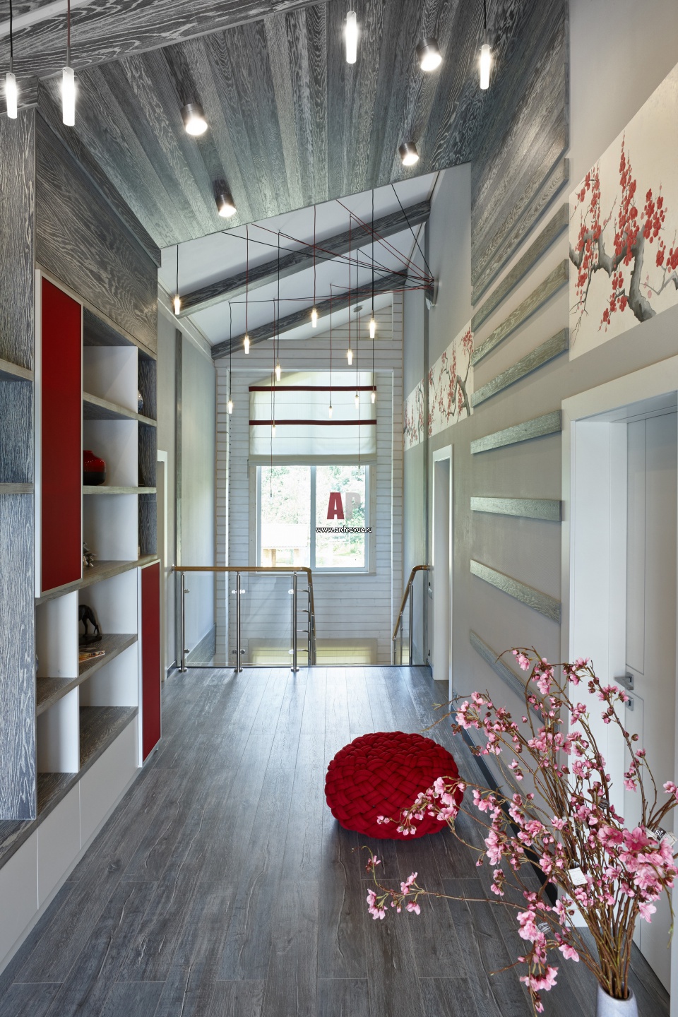 Холл второго этажа отделан панелями из термодерева благородного седого цвета.