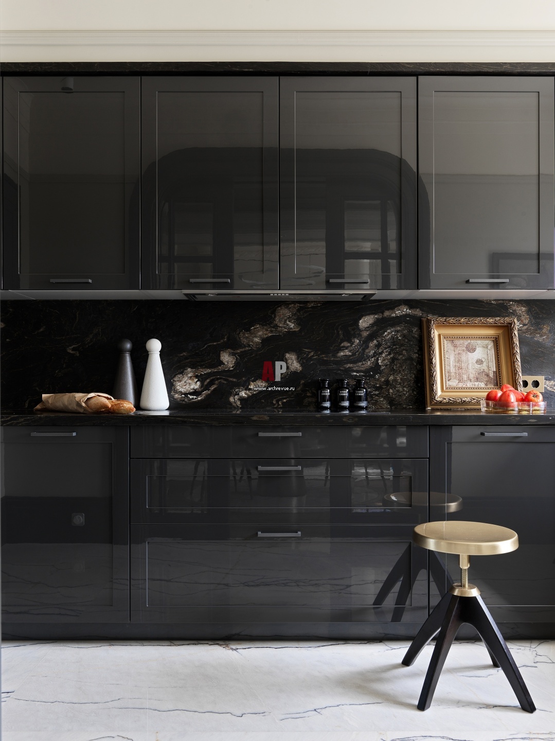 Кухня оформлена в черном цвете. Кухонный гарнитур, Leicht. Кухонный фартук из мрамора, столешница отделана гранитом Cosmic Extra. Пол из мрамора Lilac.