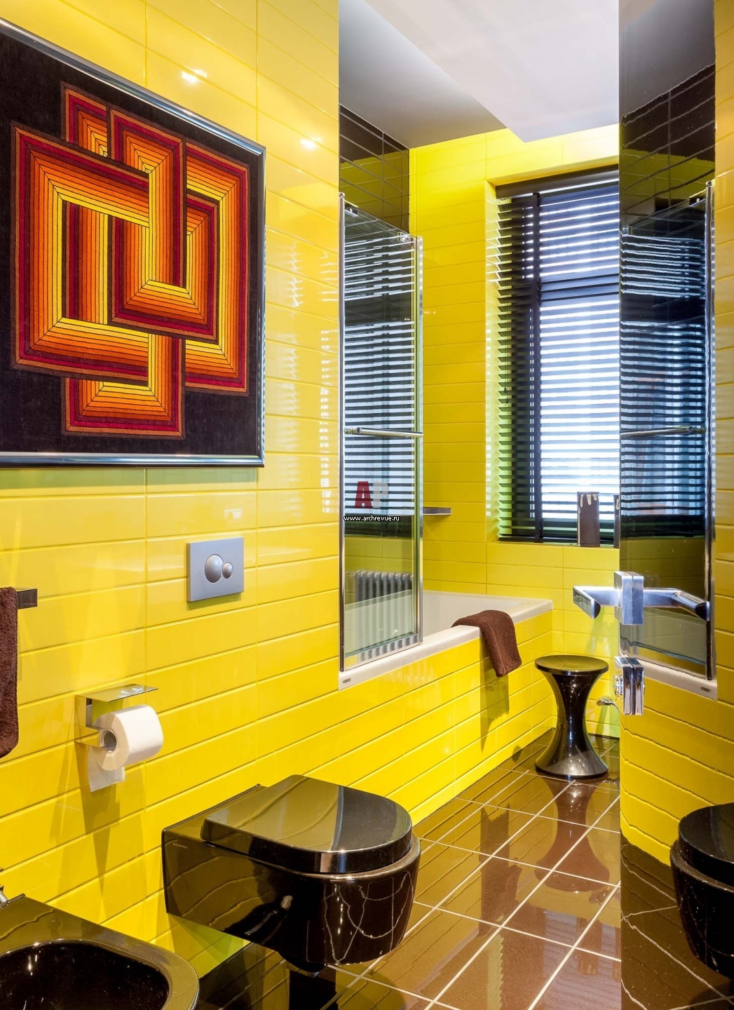 Санузел квартиры облицован желтой керамической плиткой. С ней контрастирует абсолютно черная сантехника.