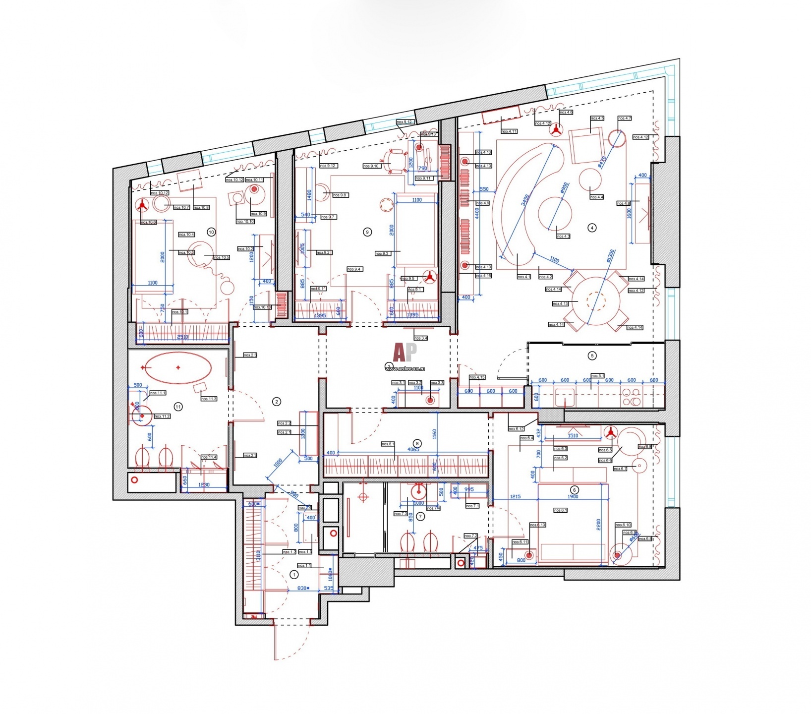 Планировка квартиры 160 кв. м в стиле mid-century.