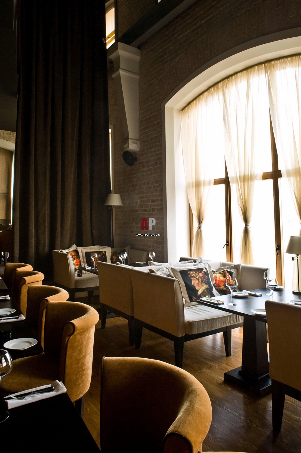 Нижний уровень основного зала имеет две линии посадки: белые кресла у окон, плюшевые диваны – вдоль надстроенной галереи.