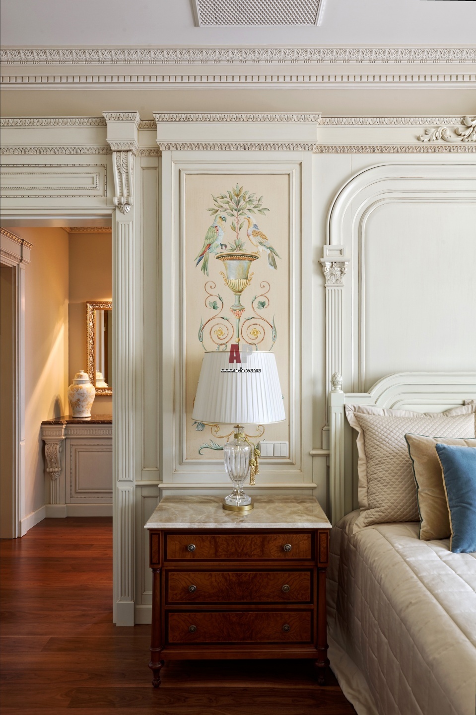 Фрагмент спальни. Роспись на панелях разработана специально для этого проекта.