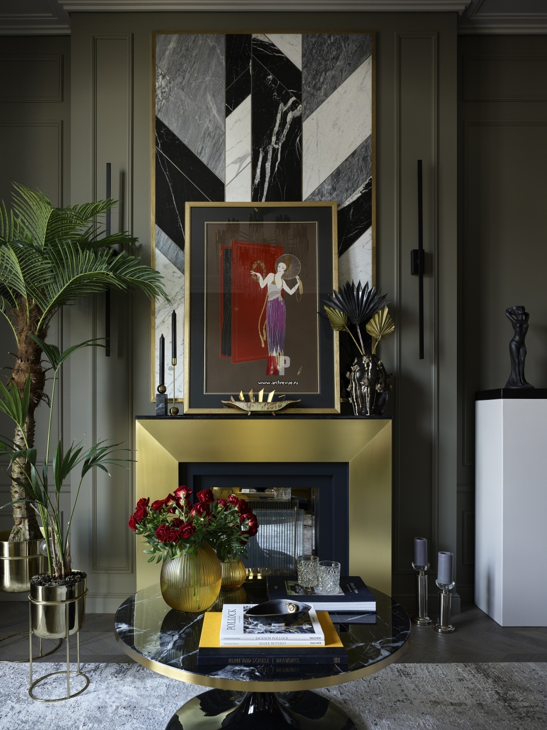 Яркий акцент гостиной – камин. Его портал выполнен из листовой латуни, дымоход оформлен геометрическим панно из натурального камня. На каминной полке - работа Эрте, New Year Eve.